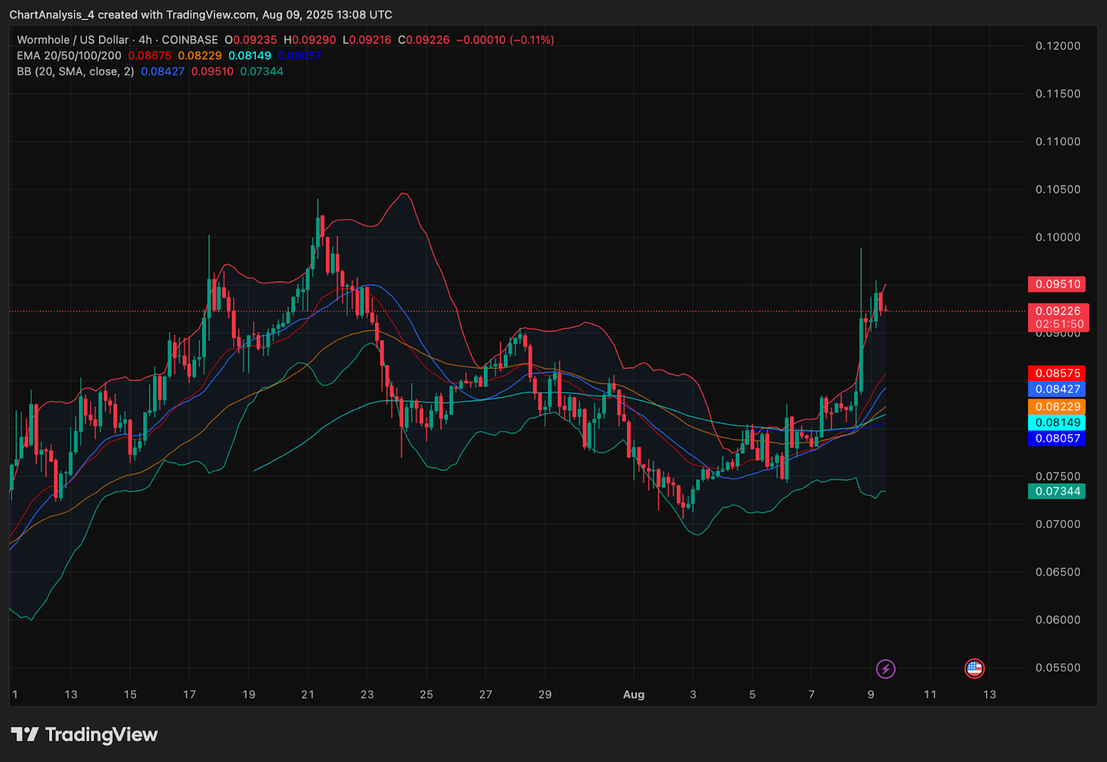 Полосы Боллинджера на 4-часовом графике резко расширились, указывая на начало новой фазы волатильности, при этом цена в настоящее время находится чуть ниже верхней полосы на уровне $0,095. Выравнивание экспоненциальных скользящих средних (EMA) остаётся положительным: 20/50/100/200 EMA расположены ниже текущей цены, обеспечивая многоуровневую динамическую поддержку в диапазоне от $0,085 до $0,081.