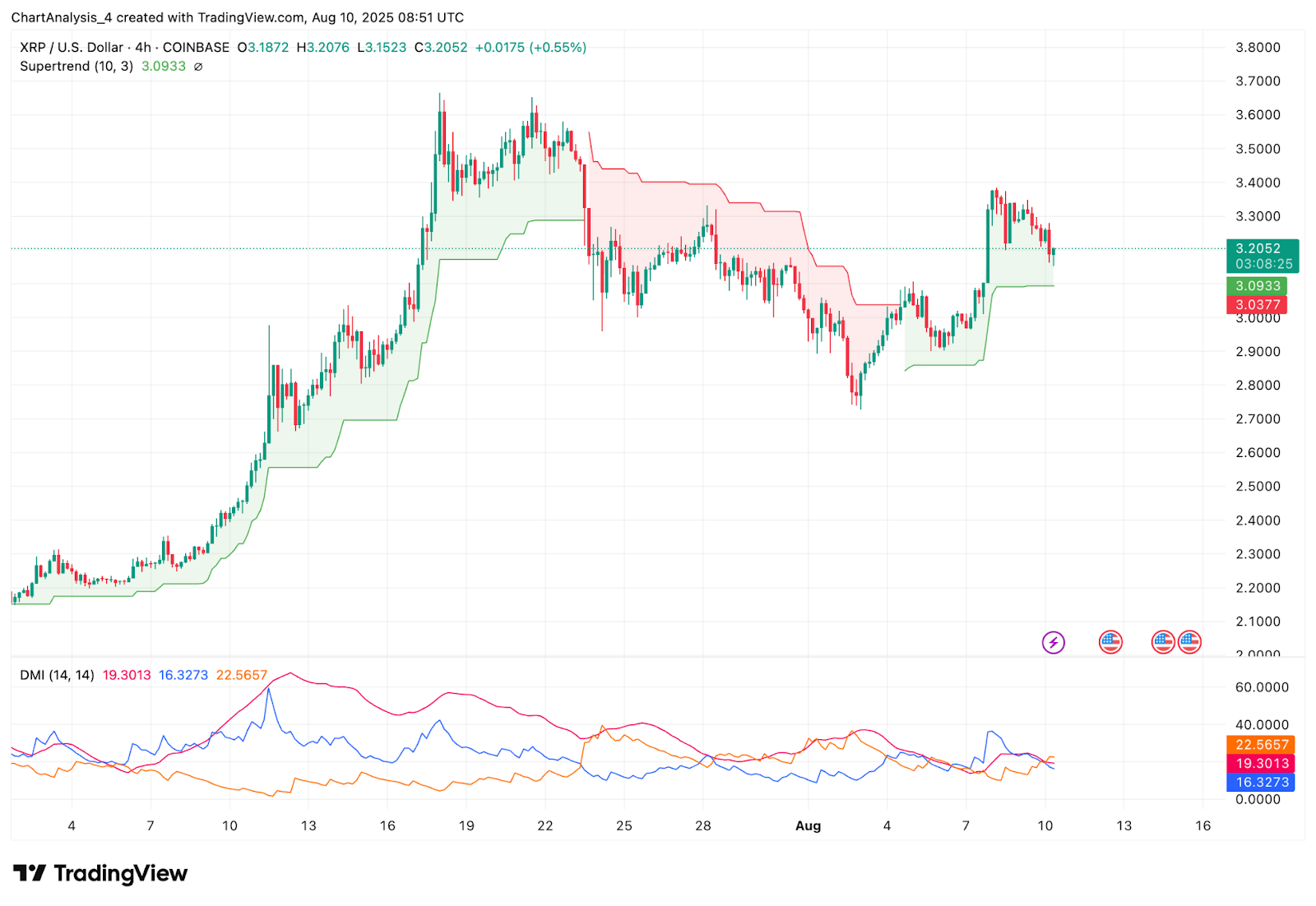 Супертренд 4H остаётся бычьим выше $3,093, укрепляя зону $3,09–$3,10 как ключевую линию защиты для покупателей. Показания DMI показывают +DI (22,56) лишь немного выше -DI (19,30), а ADX близок к 16, что подтверждает отсутствие чёткого направления текущего тренда.