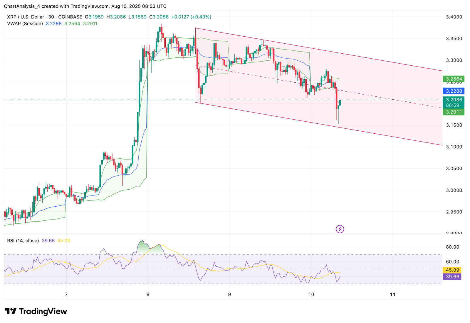 После резкого роста до $3,72 в начале этого месяца цена XRP вернулась в узкий диапазон вблизи $3,20. Покупатели защищают область поддержки $3,09–$3,10, в то время как продавцы ограничивают рост ниже $3,40. Следующие 24 часа зависят от того, сможет ли цена преодолеть краткосрочные скользящие средние и преодолеть сопротивление нисходящей линии тренда.