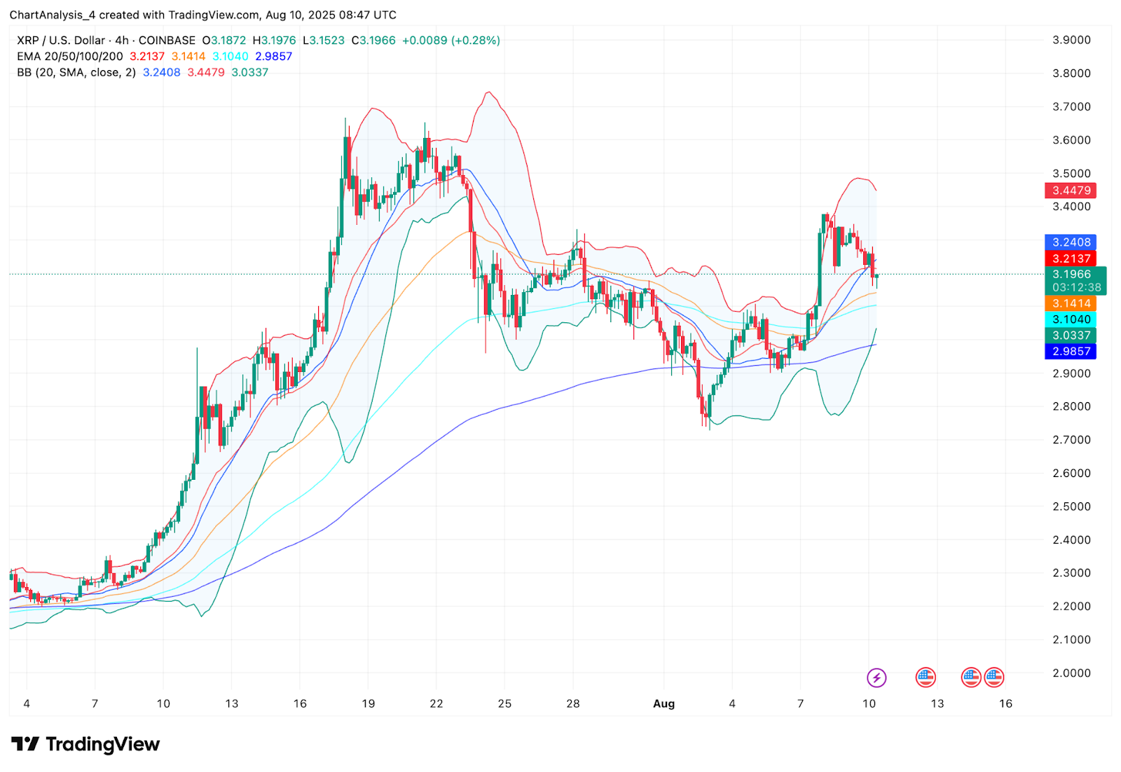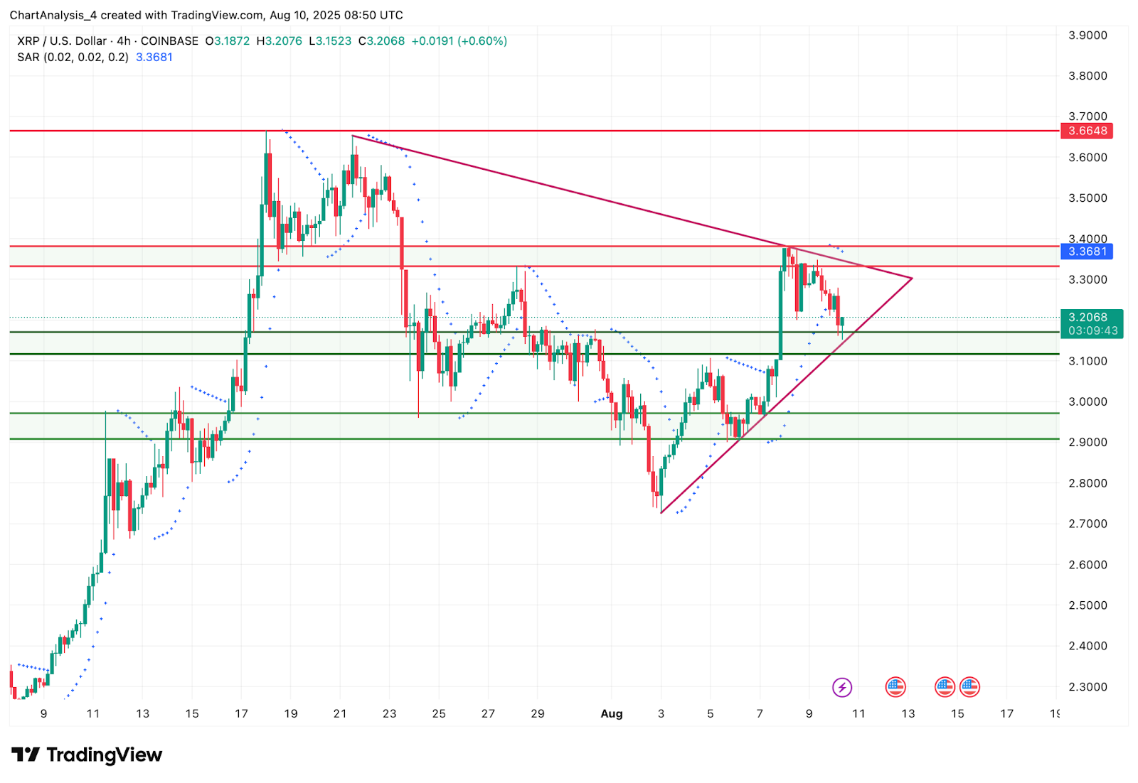На дневном графике цена XRP сегодня остаётся выше зоны июльского прорыва в районе $2,80, что поддерживает бычий тренд на старшем таймфрейме. Недавнее снижение с $3,72 привело к формированию симметричного треугольника на четырёхчасовом графике со сходящимся уровнем сопротивления на $3,368–$3,400 и уровнем поддержки в районе $3,093.