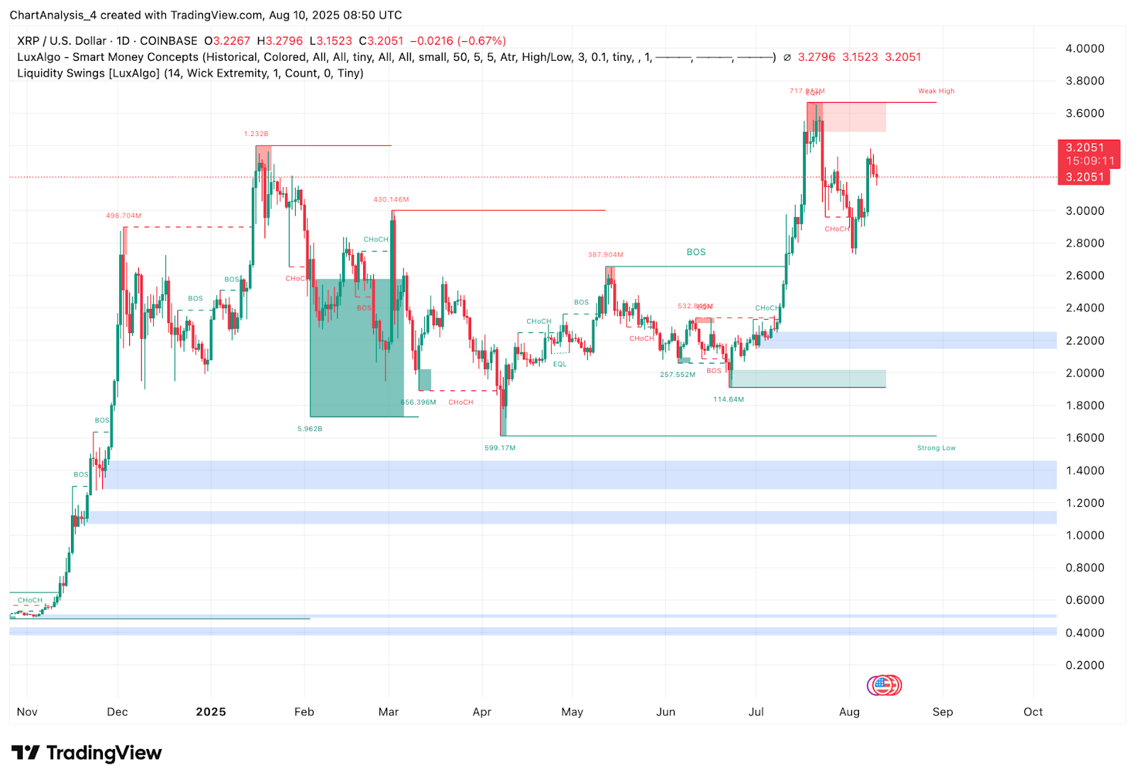 На дневном графике цена XRP сегодня держится значительно выше своего июльского прорыва базы на уровне $2,80, что поддерживает бычий тренд на более старшем таймфрейме. Данные Smart Money Concepts (SMC) показывают, что последний прорыв структуры (BOS) был бычьим от блока спроса на уровне $2,20, что подняло цену до $3,72. Этот пик на уровне $3,72 отмечен как слабый максимум, что означает, что невостребованная ликвидность покупателей находится выше.