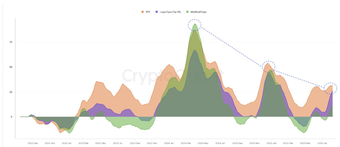 Данные CryptoQuant также показывают, что альткоины со средней капитализацией пока не начали превосходить альткоины с высокой капитализацией, как это было в конце 2024 года, что позволяет предположить, что рынок все еще находится на ранней стадии более широкого движения.