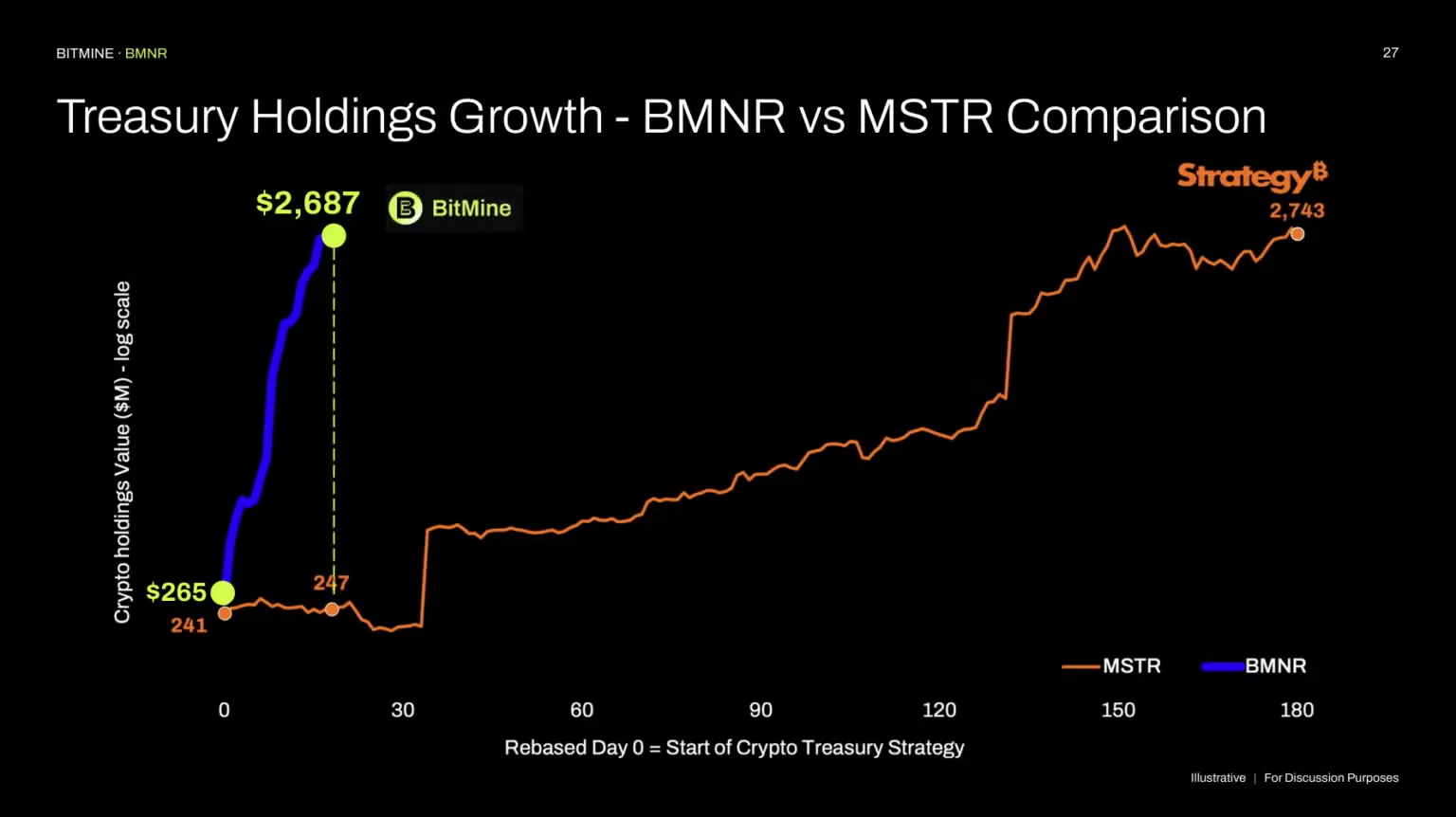 «На конец июня акции BMNR торговались по цене $4,27 за штуку, что примерно в 1,1 раза превышало их NAV в $4 на акцию после первичного привлечения капитала через DAT. Чуть более чем через месяц цена закрытия составила $51, или около 1,7x от расчетной NAV в $30 на акцию. Это представляет собой рост на 1100% всего за месяц», — подсчитали в Pantera.