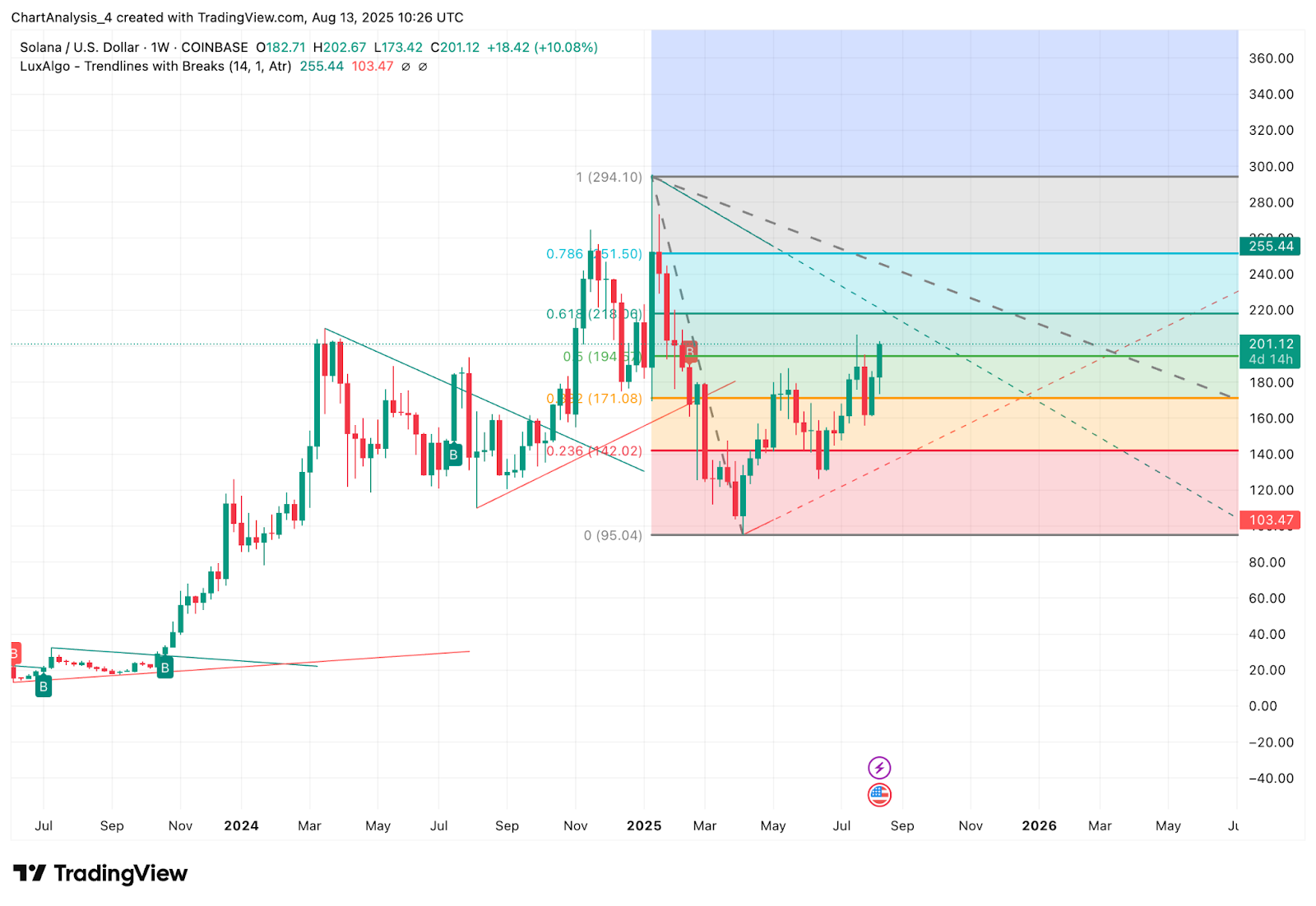 Если цена акций Solana удержится выше $200, следующая цель — $218 (уровень Фибоначчи 0,618). За этим уровнем верхняя граница канала и среднесрочная цель — $230. Решительный прорыв $218 при сильном объёме может открыть путь к $255 (уровню Фибоначчи 0,786).