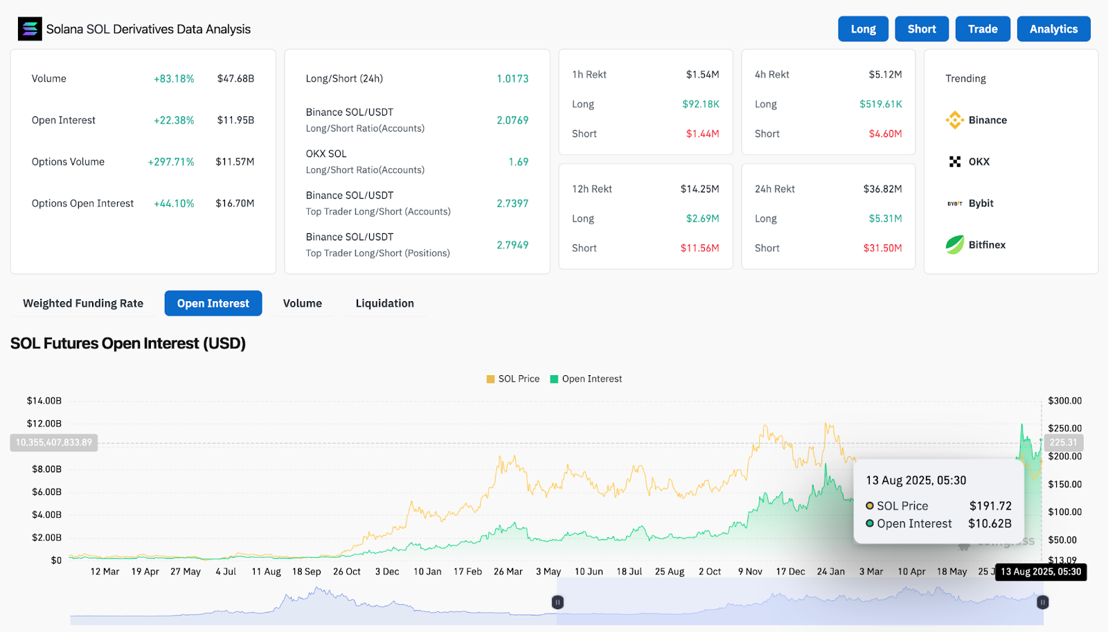 Цена акций Solana торгуется около $201,15 после резкого роста, преодолевшего несколько уровней сопротивления. Этот прорыв уверенно изменил рыночные настроения на бычьи, поскольку цена выходит из многонедельной фазы сжатия и входит в верхнюю половину своего восходящего канала. Данные по деривативам демонстрируют всплеск открытого интереса и активное формирование длинных позиций, поэтому трейдеры оценивают, сможет ли этот тренд продолжиться до следующей цели Фибоначчи.
