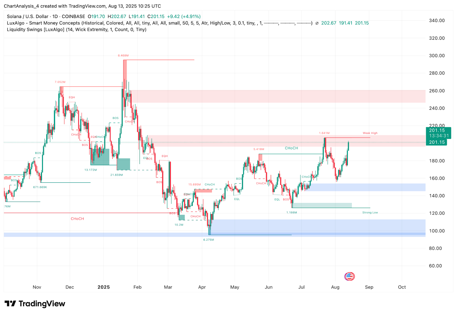Технический прорыв и высокая активность на рынке деривативов стимулируют рост цены Solana сегодня. Smart Money Concepts на дневном графике показывает явный прорыв структуры (BOS) выше $196, при этом ликвидность изымается из зоны предложения $200–$202. Сейчас мы тестируем «слабый максимум» на уровне $202, и успешное закрытие выше этого уровня может потенциально спровоцировать дальнейший рост.