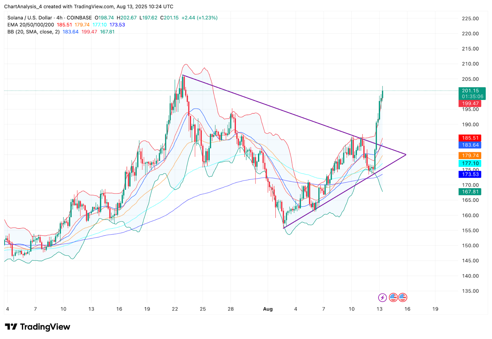 Прорыв подтверждается на 4-часовом графике, где цена вышла за пределы симметричного треугольника, закрывшись значительно выше сопротивления EMA20 на уровне $185,50. Полосы Боллинджера резко расширились, указывая на рост волатильности. Все EMA (20/50/100/200) расположены ниже текущей цены, что свидетельствует о бычьем тренде, при этом EMA 200 на уровне $173,53 обеспечивает сильную динамическую поддержку.