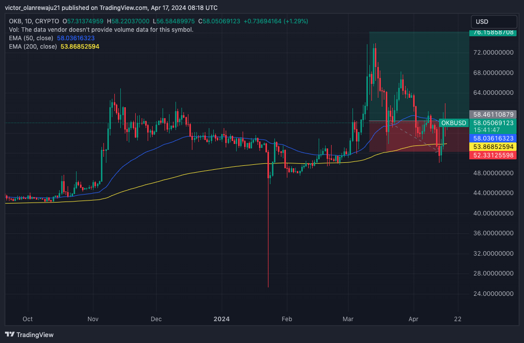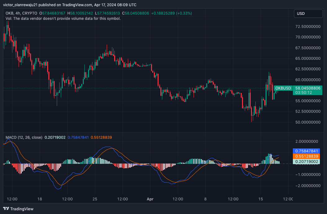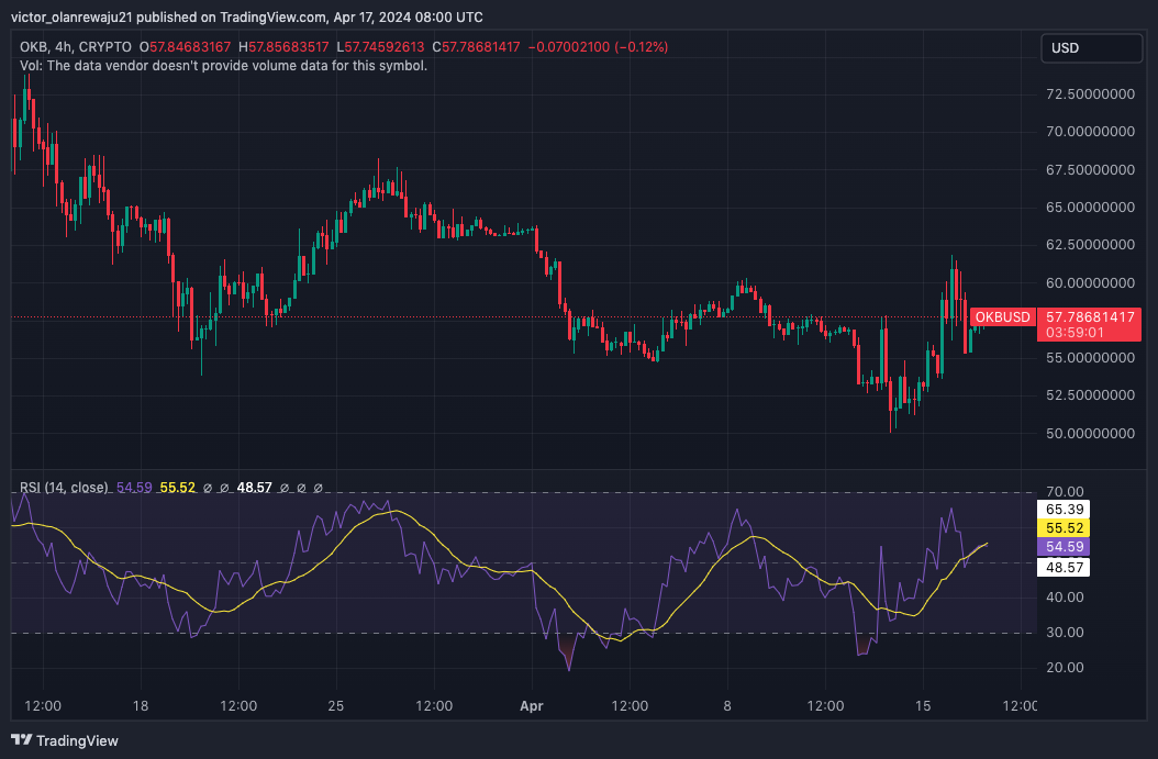 RSI сформировал положительную дивергенцию между 12 и 16 апреля, когда OKB вырос до $61,62. Однако на момент публикации этот импульс изменился. На момент написания статьи RSI снизился до 54,87, что указывает на снижение бычьего движения.