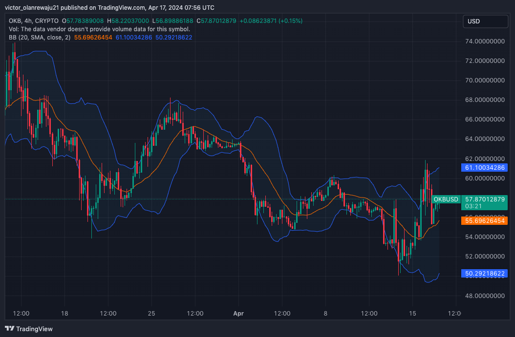 На 4-часовом графике OKB/USD токен испытывал высокую волатильность в разные периоды. Это было видно по сигналам, которые показывали полосы Боллинджера (BB). Примерно 12 апреля полосы сузились, что указывает на низкий уровень ценовых колебаний.
