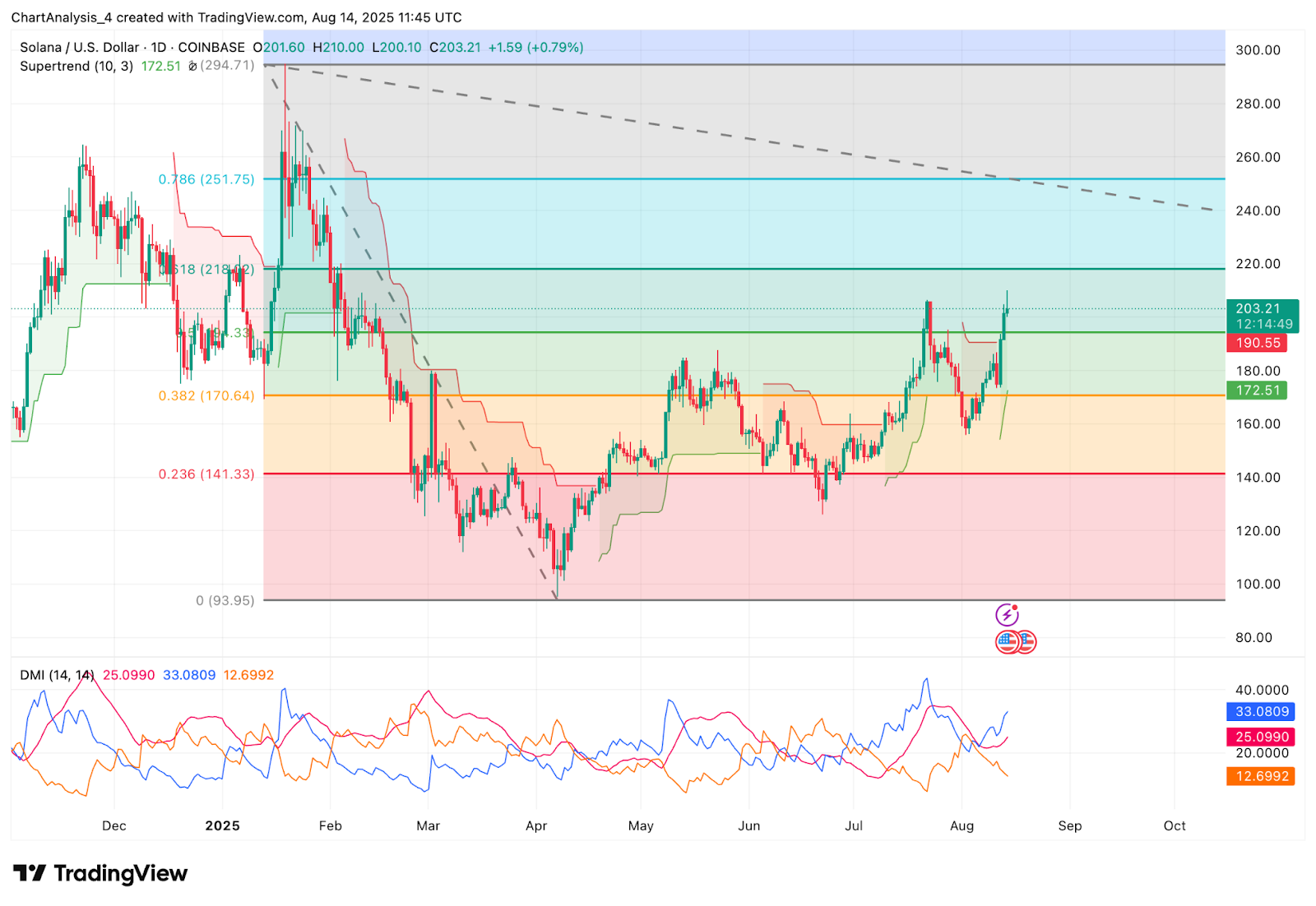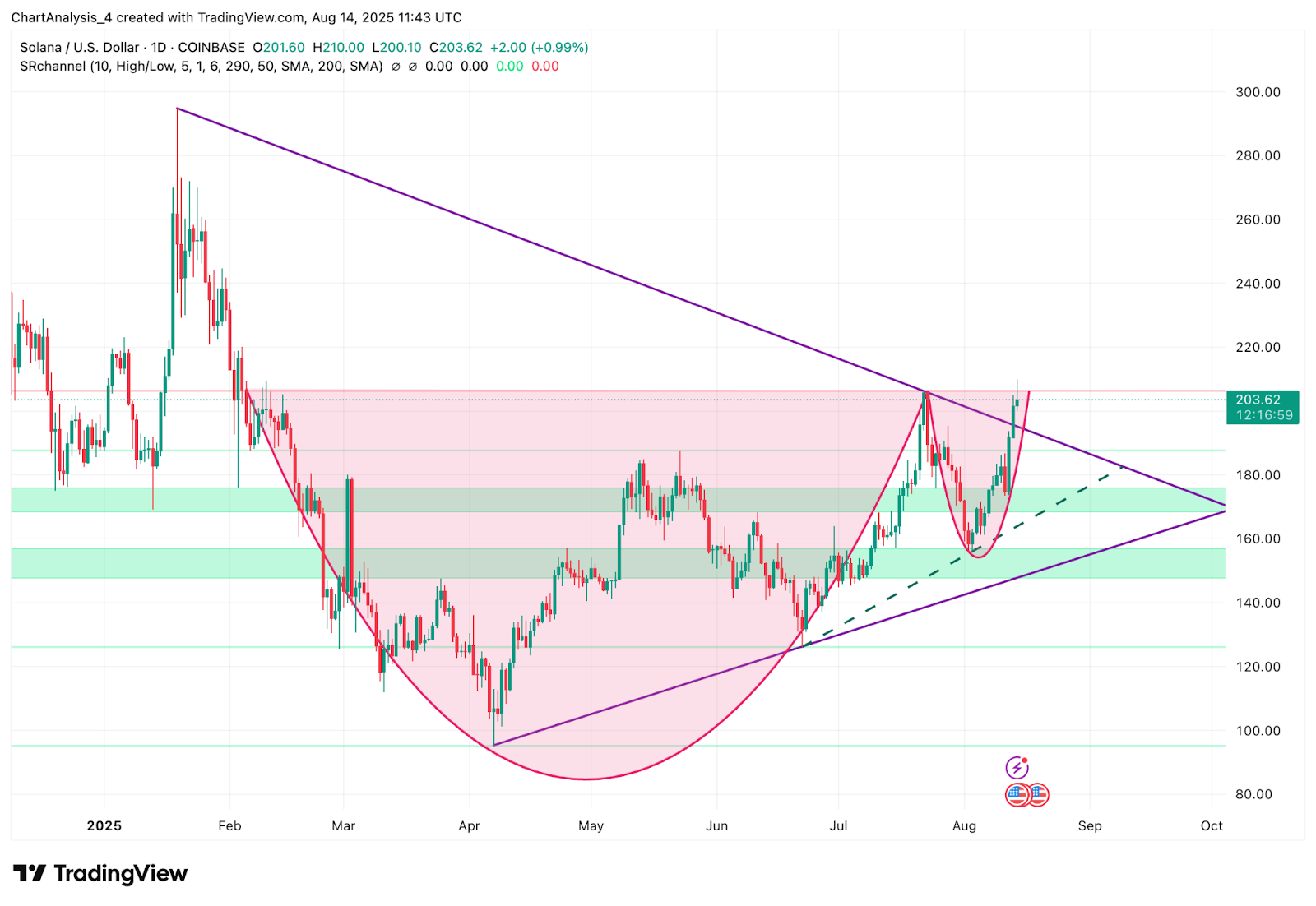 Акции Solana продолжили свой бычий прорыв, в результате чего цена сегодня поднялась до $203,34 после непродолжительного тестирования $210. Это движение произошло после сильного отскока от зоны спроса $140–$150 и подтверждённого пробоя крупной фигуры «Чашка с ручкой» на дневном графике. Трейдеры следят за уровнем $218 как за следующим важным уровнем сопротивления.