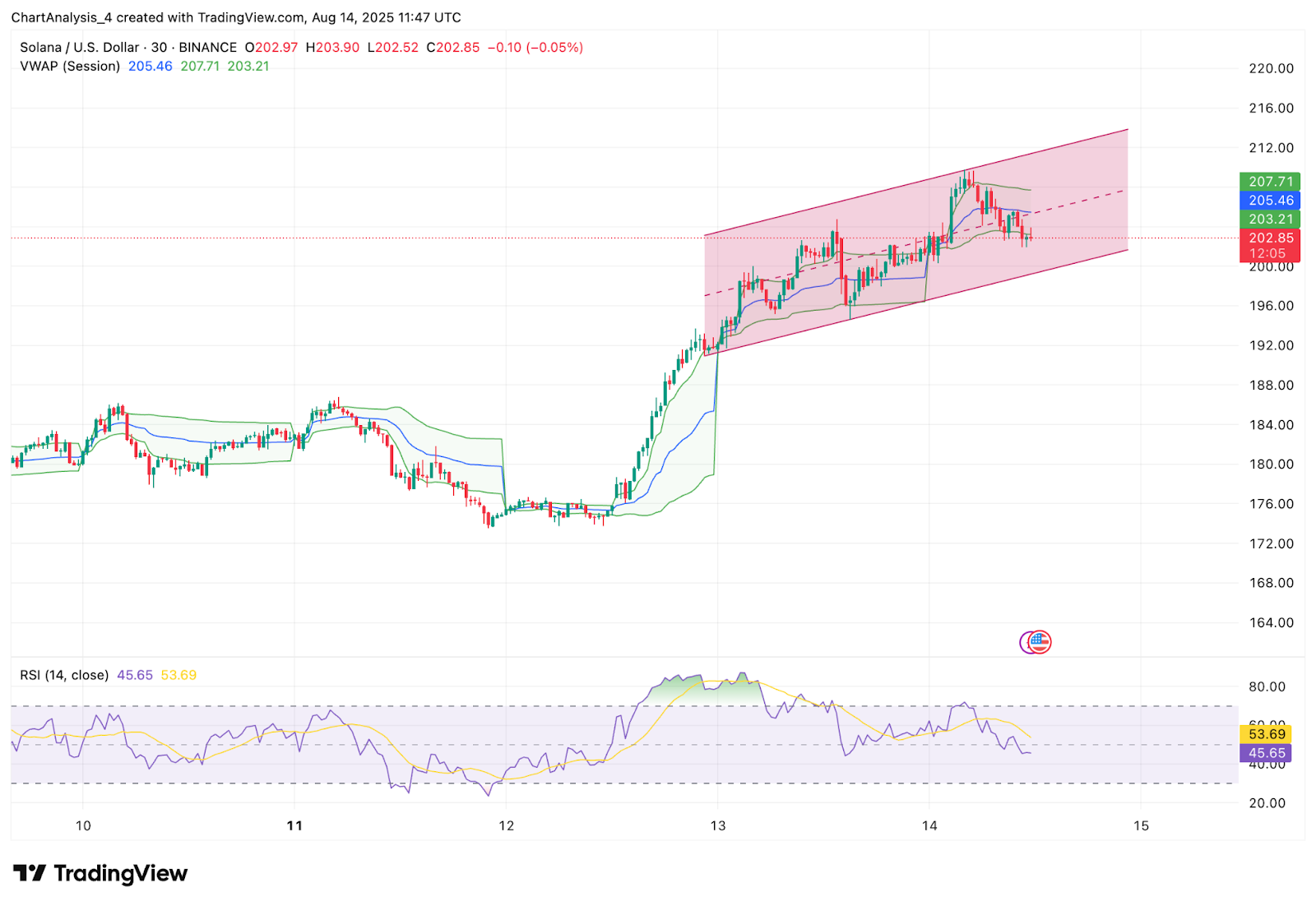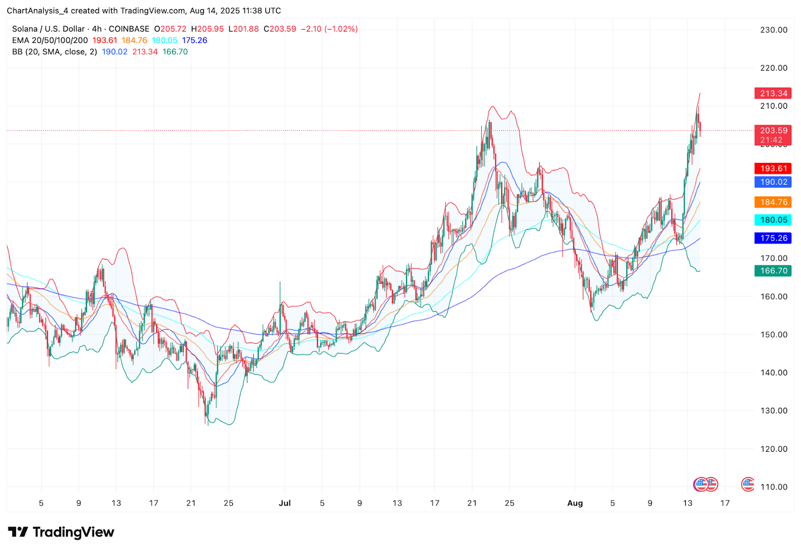 Росту цены Solana способствовало сочетание позитивных технических факторов и благоприятных рыночных потоков. На 4-часовом графике SOL по-прежнему находится выше кластера EMA 20/50/100/200 (EMA20 на уровне $193,61), что свидетельствует о крайне оптимистичном настрое рынка. Полосы Боллинджера расширяются, а цена остаётся вблизи верхней полосы на уровне $213,34, что свидетельствует о наличии сильного импульса.