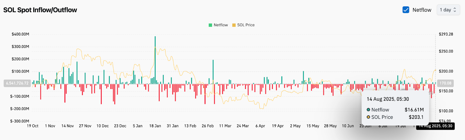 Потоки спотового рынка также демонстрируют чистый приток в размере 16,61 млн долларов США 14 августа, что свидетельствует о поступлении свежего капитала в SOL и поддержании структуры прорыва.