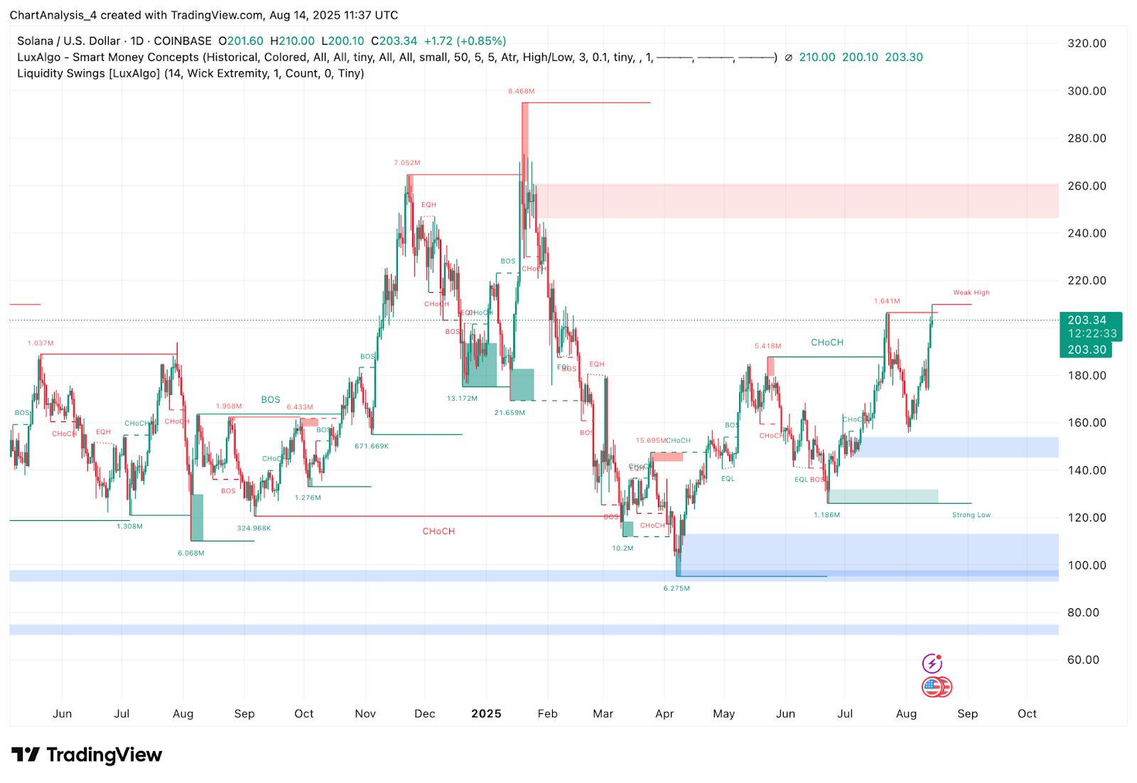 Дневная структура показывает, что цена уверенно растёт с начала августа. Она пробила уровень сопротивления $190 и достигла «слабого максимума» ликвидности на уровне $203. Недавние ценовые колебания также вызвали ряд сигналов «разрыва структуры» (BOS), которые подтвердили, что покупатели доминируют. Согласно данным Smart Money Concepts, на уровне $115 имеется сильный уровень поддержки, а диапазон $140–$150 стал отправной точкой для последнего движения.