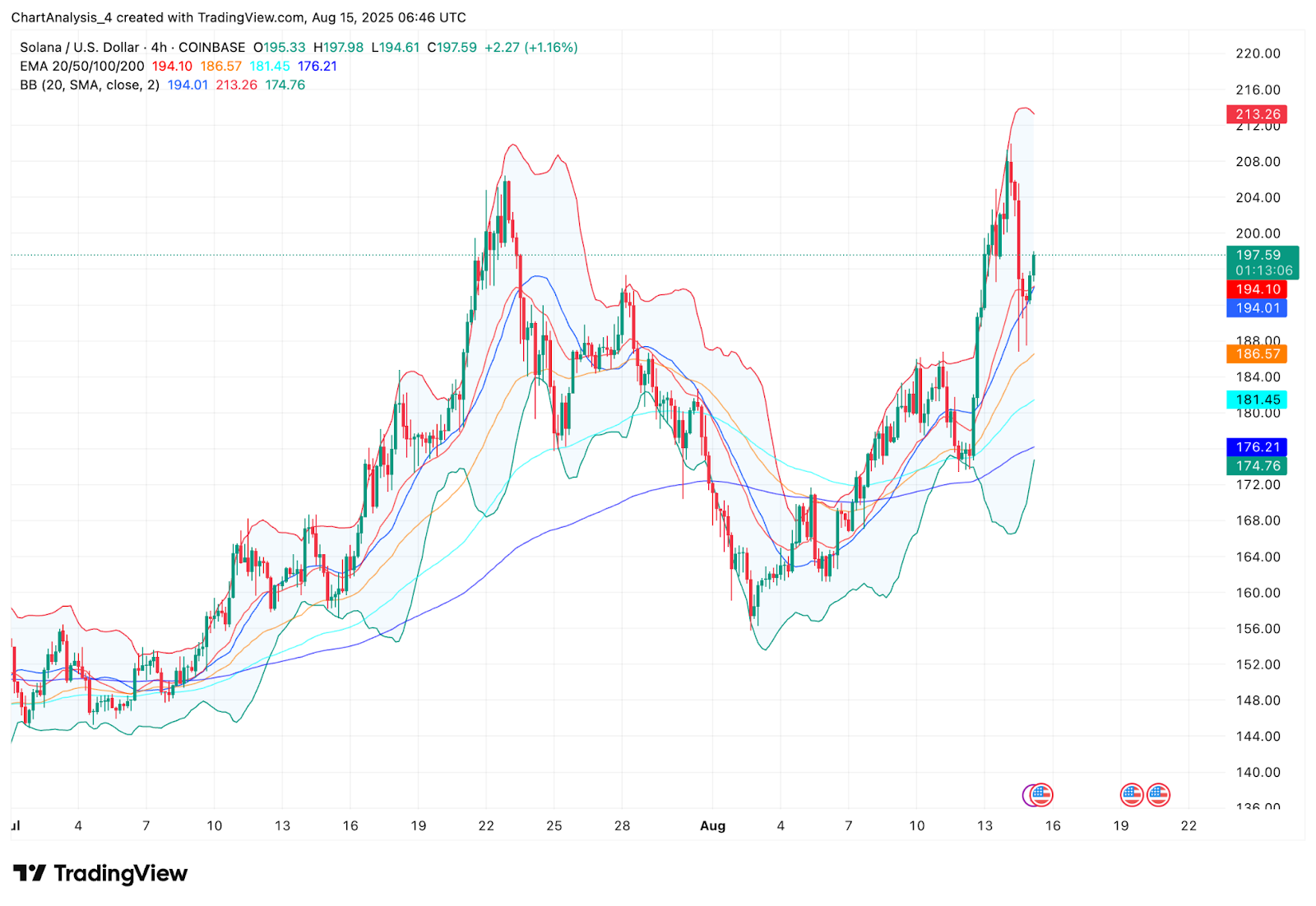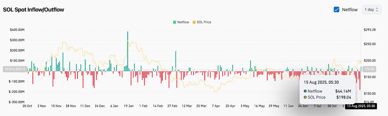 Спотовые потоки на блокчейне поддерживают последний рост цены Solana. Данные показывают чистый приток в размере 44,14 млн долларов США 15 августа, что указывает на активное участие покупателей. Это вливание капитала совпало с отскоком от кластера 4-часовой экспоненциальной скользящей средней (EMA), где 20-часовая EMA на уровне $194,10 и 50-часовая EMA на уровне $186,57 обеспечили прочную базу поддержки.