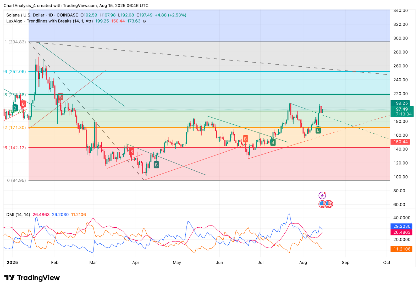 Если цена акций Solana сегодня превысит $199,25 и удержится выше него, следующими целями роста станут $210 и $213,26. Решительное закрытие выше $213 может спровоцировать ускорение к $225–$230, особенно если это будет сопровождаться ростом показаний ADX.
