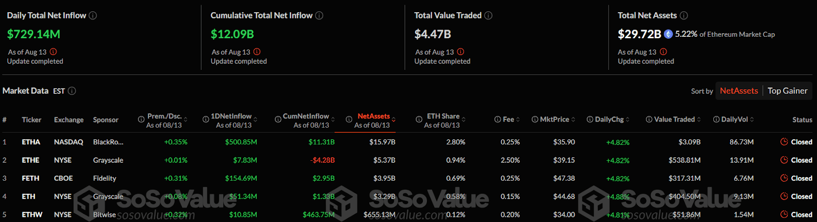 Драйвером роста Ethereum до $4700 стали спотовые ETF . Чистый приток в них за последние сутки составил $729 млн — второй по величине дневной показатель.