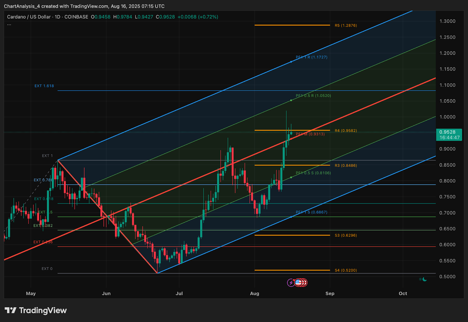 Проекция канала показывает, что ADA тестирует опорную точку R4 на уровне $0,9582, с потенциалом для роста до $1,05 и $1,17, если импульс сохранится. С другой стороны, опорные точки находятся на $0,81 и $0,68, обеспечивая надежные буферы снижения.