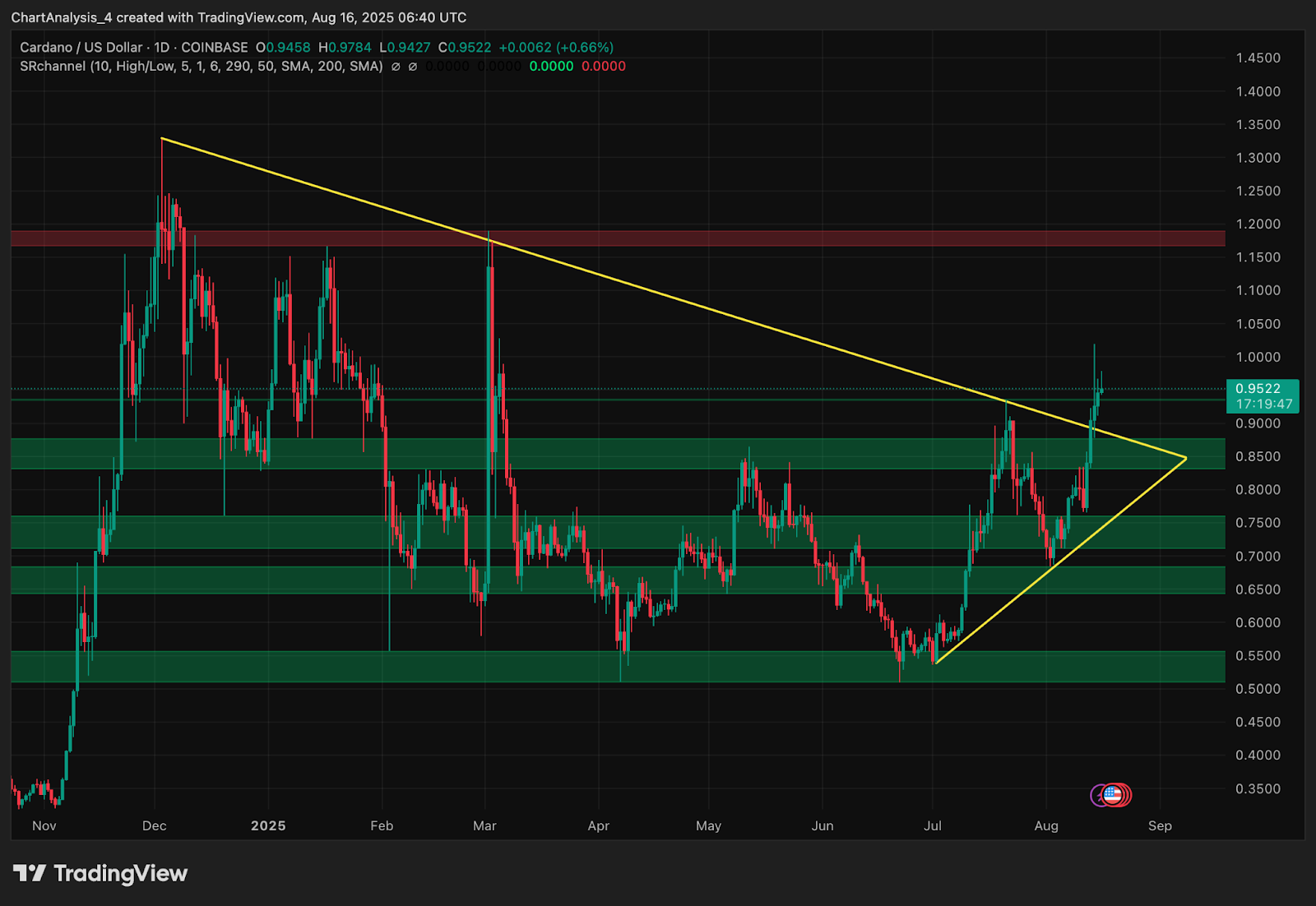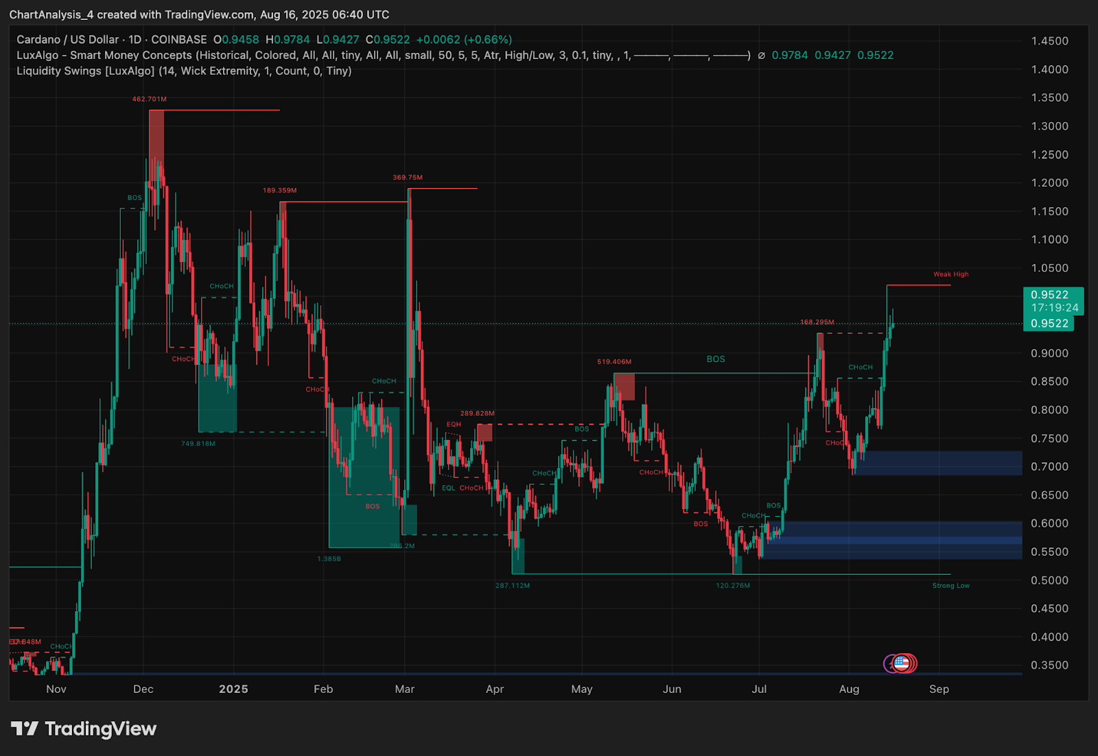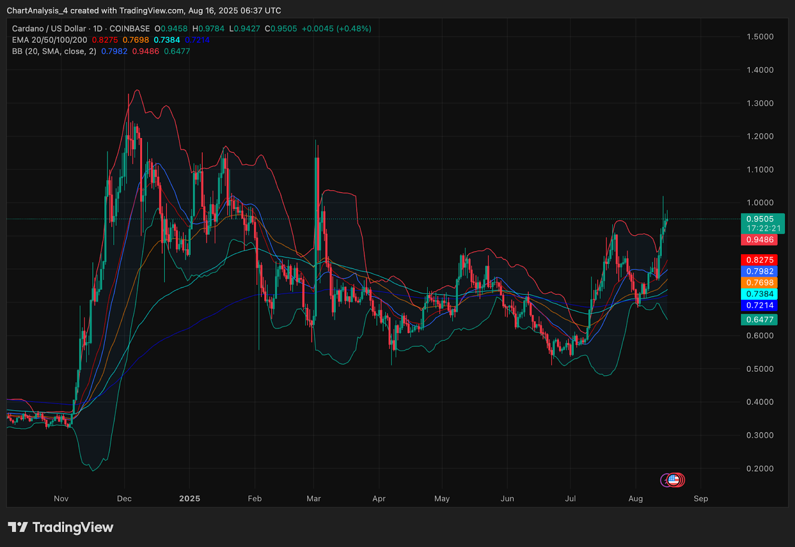 Cardano продемонстрировал резкий рост: сегодня цена Cardano достигла $0,95, восстановив ключевые технические уровни после нескольких недель консолидации. Положительные биржевые потоки и структурные прорывы на разных таймфреймах поддержали ралли, создав условия для повышенной волатильности к 17 августа.
