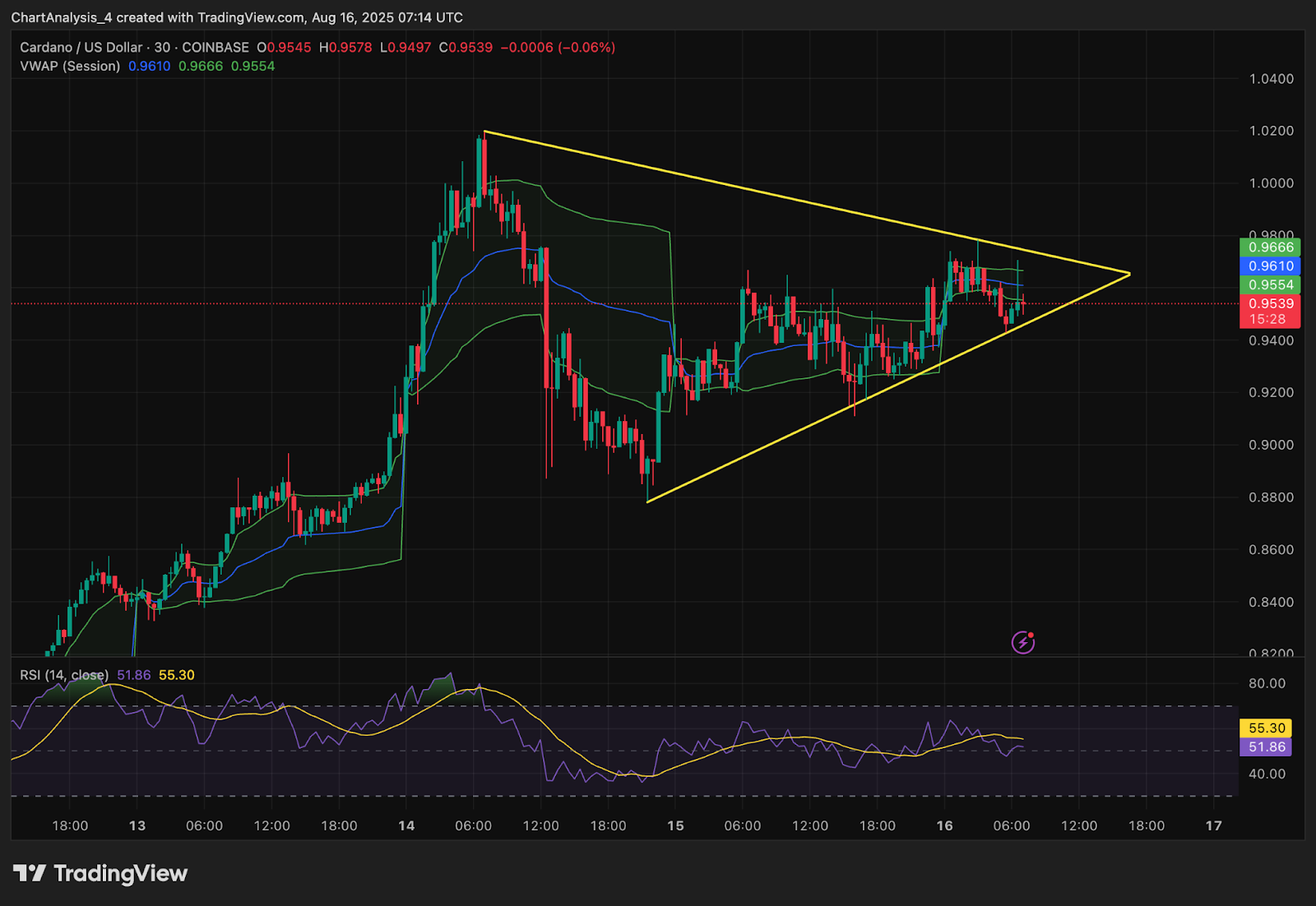 На 30-минутном графике ADA движется внутри симметричного треугольника, а VWAP обеспечивает внутридневную поддержку вблизи $0,9554. Эта консолидация после прорыва указывает на подготовку к следующему этапу. Если ADA закроется выше $0,96–$0,97 с сохранением импульса, сжатие может продолжиться в сторону роста.
