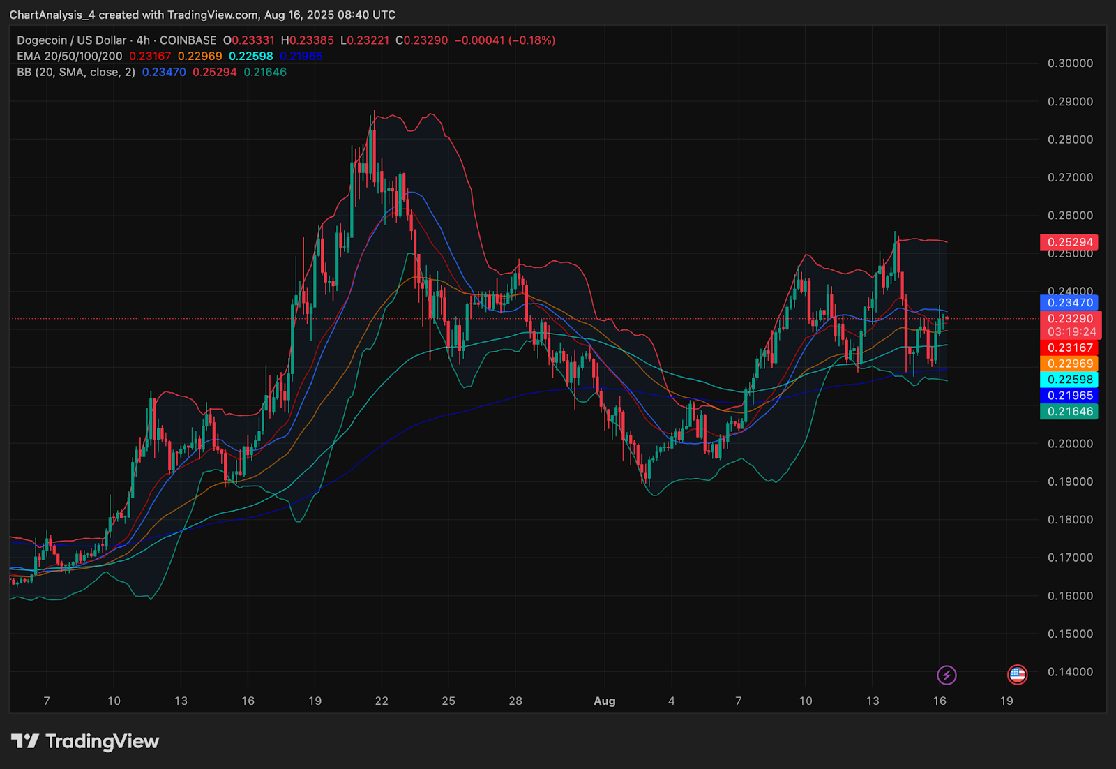На 4-часовом графике DOGE торгуется между EMA20 ($0,2316) и EMA50 ($0,2296), при этом полосы Боллинджера сужаются около $0,232. Эта схема демонстрирует сжатие цены, часто предшествующее росту волатильности.