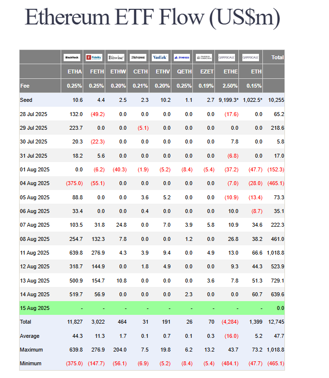 Приток средств в ETF усилил эту тенденцию: спотовые фонды Ethereum привлекли более 3 млрд долларов всего за семь торговых дней. Самый большой приток средств за один день пришёлся на 9 августа, когда ETHA от BlackRock привлекла 639,8 млн долларов. 14 августа ETHA зафиксировала ещё один существенный чистый приток в размере 519,7 млн долларов, сохранив высокую динамику.