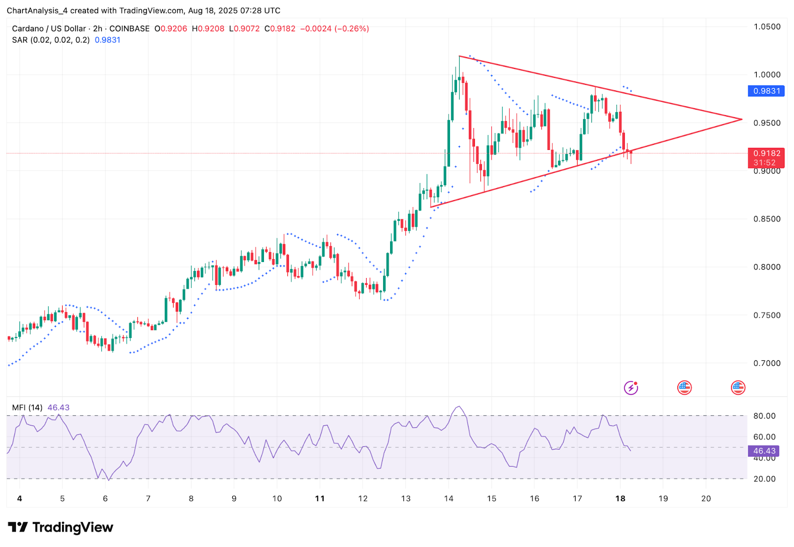 Текущая конфигурация ADA демонстрирует смешанные сигналы. Хотя ADA остаётся в восходящем тренде от минимумов июля, внутридневные сигналы указывают на медвежий тренд. Parabolic SAR на 2-часовом графике развернулся выше ценового тренда в районе $0,98, усиливая текущий нисходящий тренд. Симметричный треугольник, формирующийся с середины августа, достигает своей вершины, при этом цена колеблется между уровнем поддержки $0,91 и уровнем сопротивления $0,98.