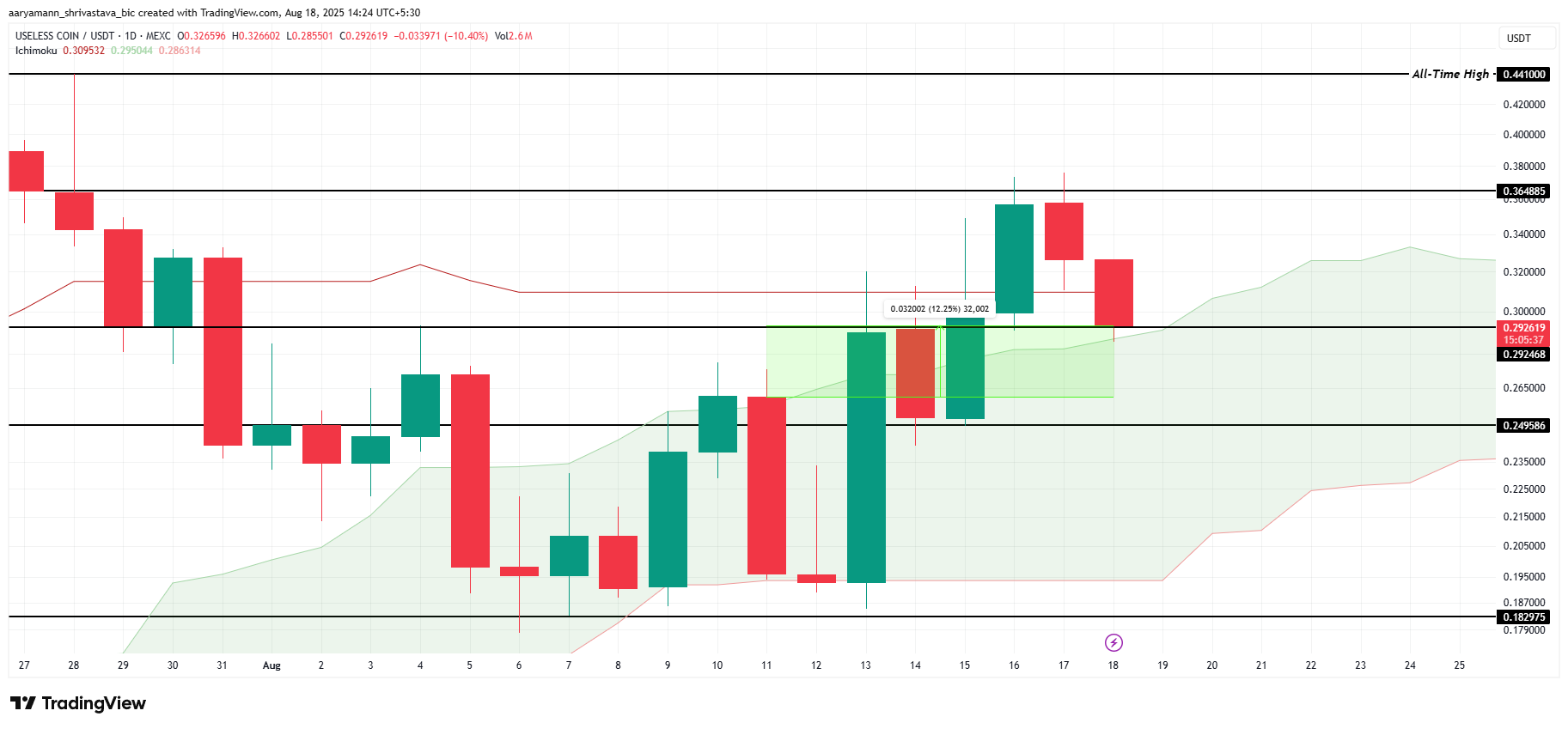 Индикатор Облако Ишимоку указывает на бычий импульс USELESS, предполагая, что цена мемкоина может отскочить от $0,292. Если восходящий тренд продолжится, актив может достичь $0,364, ключевого уровня сопротивления. Преодоление этого барьера позволит USELESS приблизиться к историческому максимуму $0,441 и привлечь больше инвесторов.