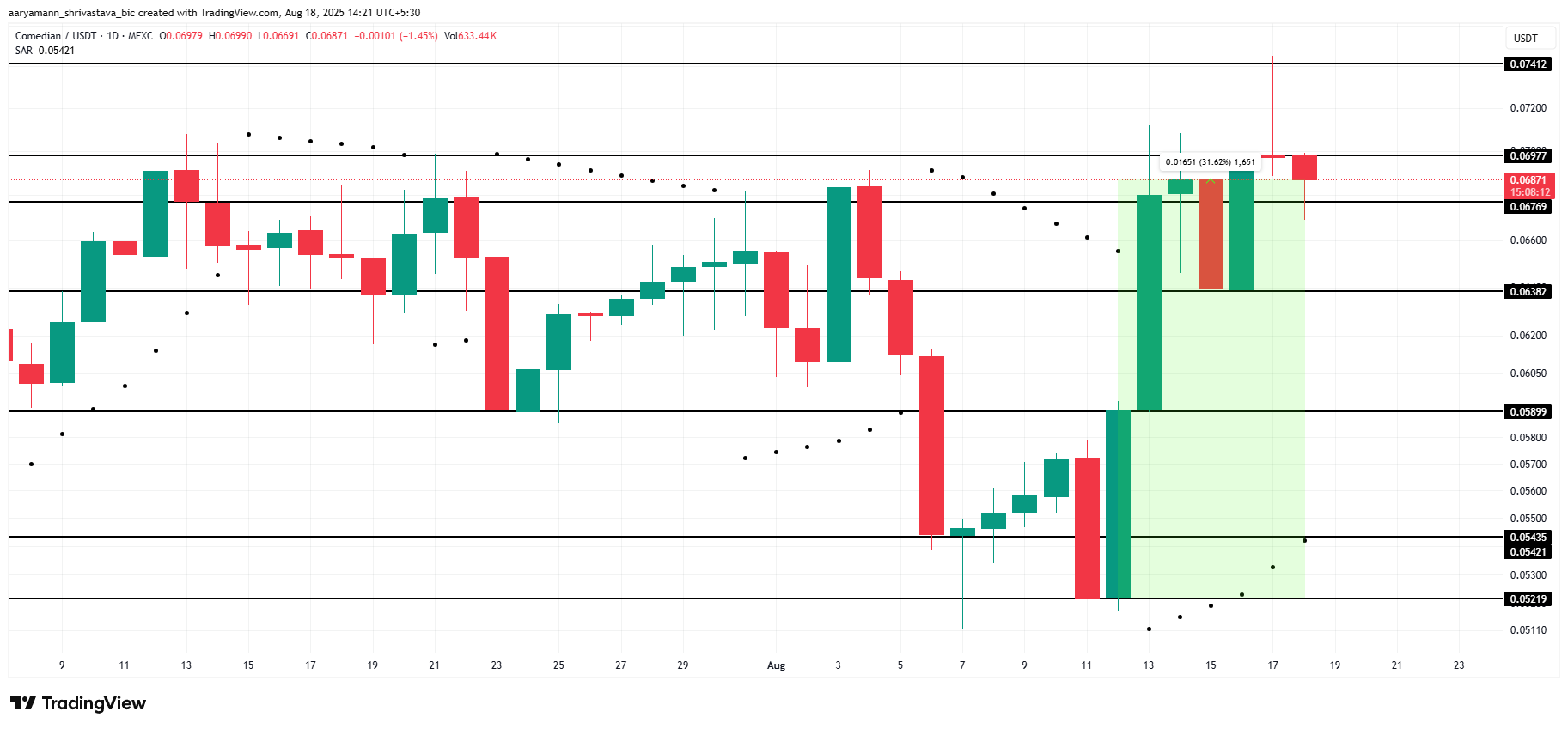 BAN стал одним из лидеров среди мемкоинов, увеличившись на 31,6% за последние семь дней. Сейчас он демонстрирует сильный восходящий тренд и пытается преодолеть сопротивление на $0,069, которое сдерживало токен более месяца. Точки индикатора Parabolic SAR располагаются под свечами, что указывает на активный бычий тренд. Если покупатели продолжат давить, BAN может взять этот барьер и достичь $0,074.