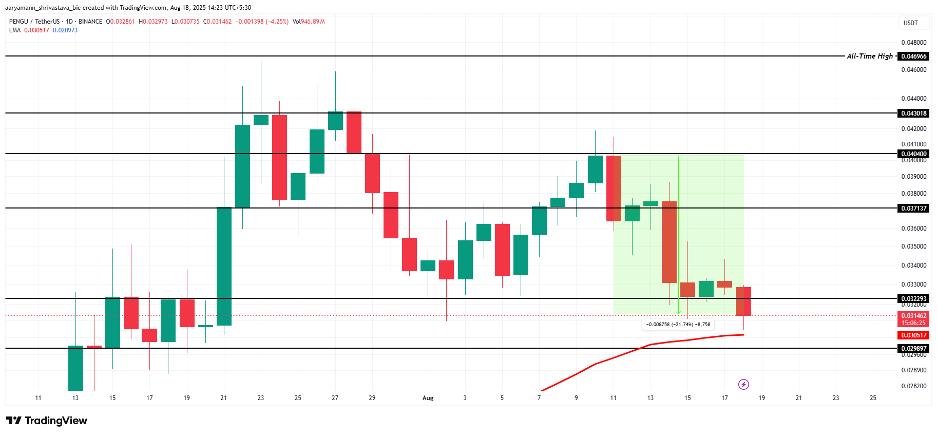 Несмотря на спад, PENGU все еще держится выше важной 50-дневной экспоненциальной скользящей средней (EMA), что указывает на возможность восстановления. Чтобы вернуть утраченные позиции, монете нужно подняться выше уровня поддержки $0,0322. Это может вдохновить цену на отскок и вернуть доверие инвесторов.