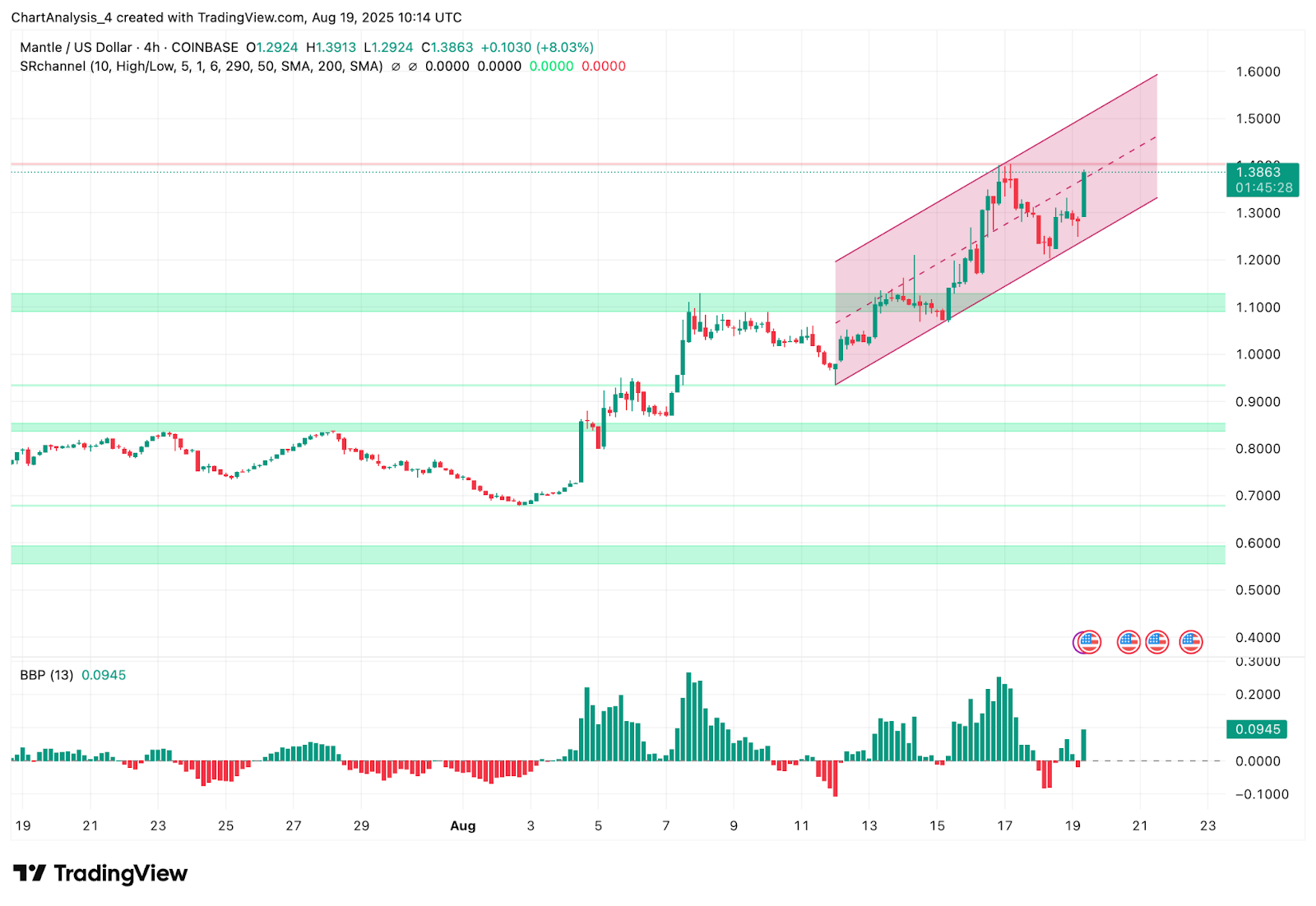 С середины августа акции Mantle двигались вверх и вниз в восходящем канале, при этом более высокие минимумы обеспечивали устойчивую структурную поддержку. Цена резко отскочила от дна канала в районе $1,29 на 4-часовом графике и сейчас тестирует верхнюю среднюю линию в районе $1,40. Анализ объёма показывает явный рост во время отскока, а индекс баланса сил (BBP) находится в положительном диапазоне, что усиливает бычий импульс.