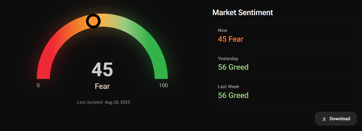 На фоне этого индекс страха и жадности, который служит индикатором настроений трейдеров, за последние 24 часа снизился на 11 баллов, упав в «оранжевую» зону. В последний раз такое низкое значение показателя наблюдалось в конце июня 2025 года.