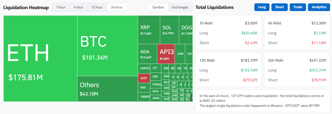 Суточный объем ликвидаций составляет более $451 млн. Это преимущественно длинные позиции по биткоину и Ethereum. Под принудительное закрытие контрактов попали свыше 127 000 трейдеров:
