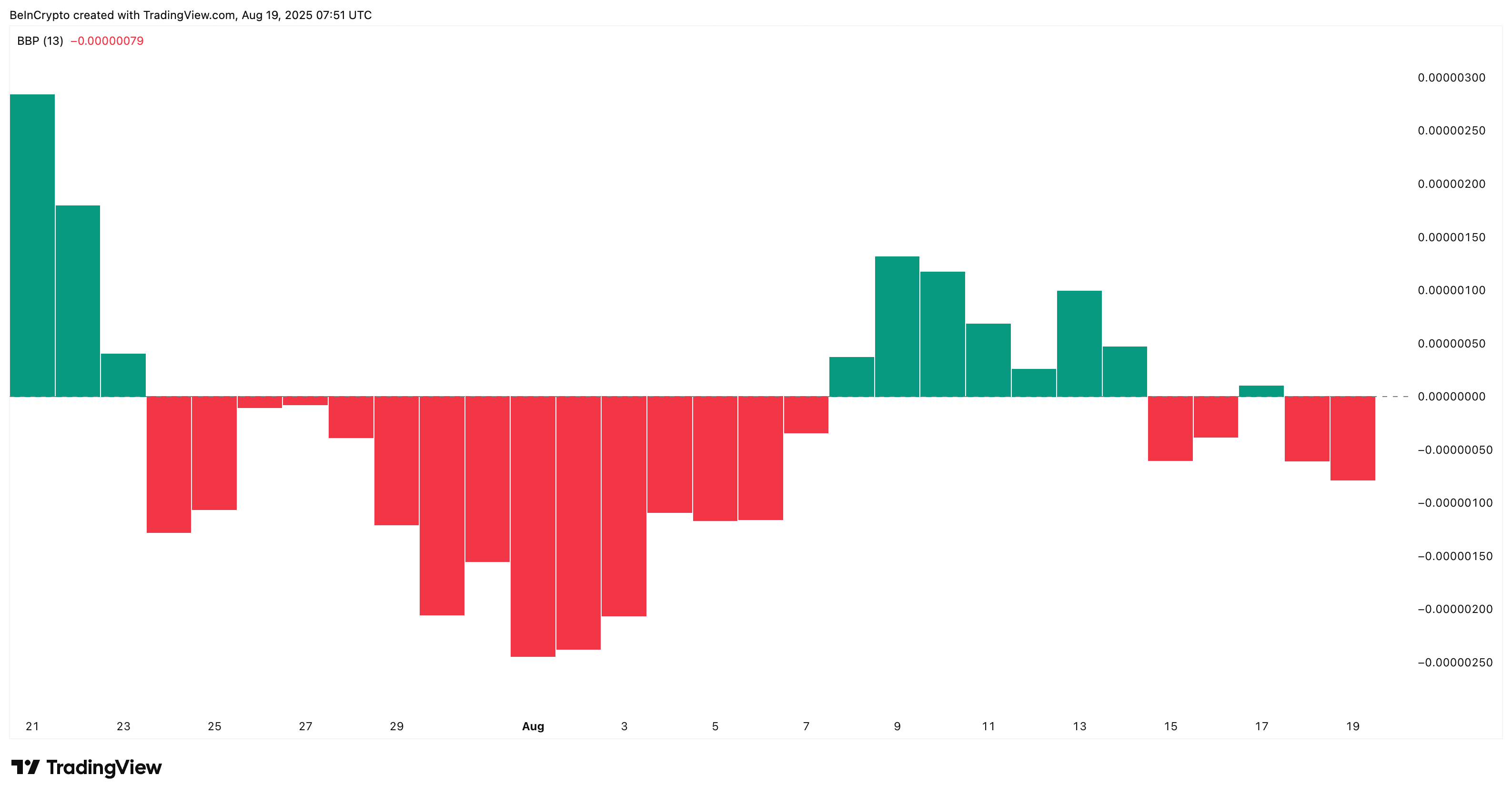 Хотя снижение активности кажется незначительным, оно соответствует медвежьему тренду. Индикатор Bull-Bear Power (BBP) показывает рост давления продаж, указывая на то, что медведи постепенно берут под контроль ценовую динамику Shiba Inu.