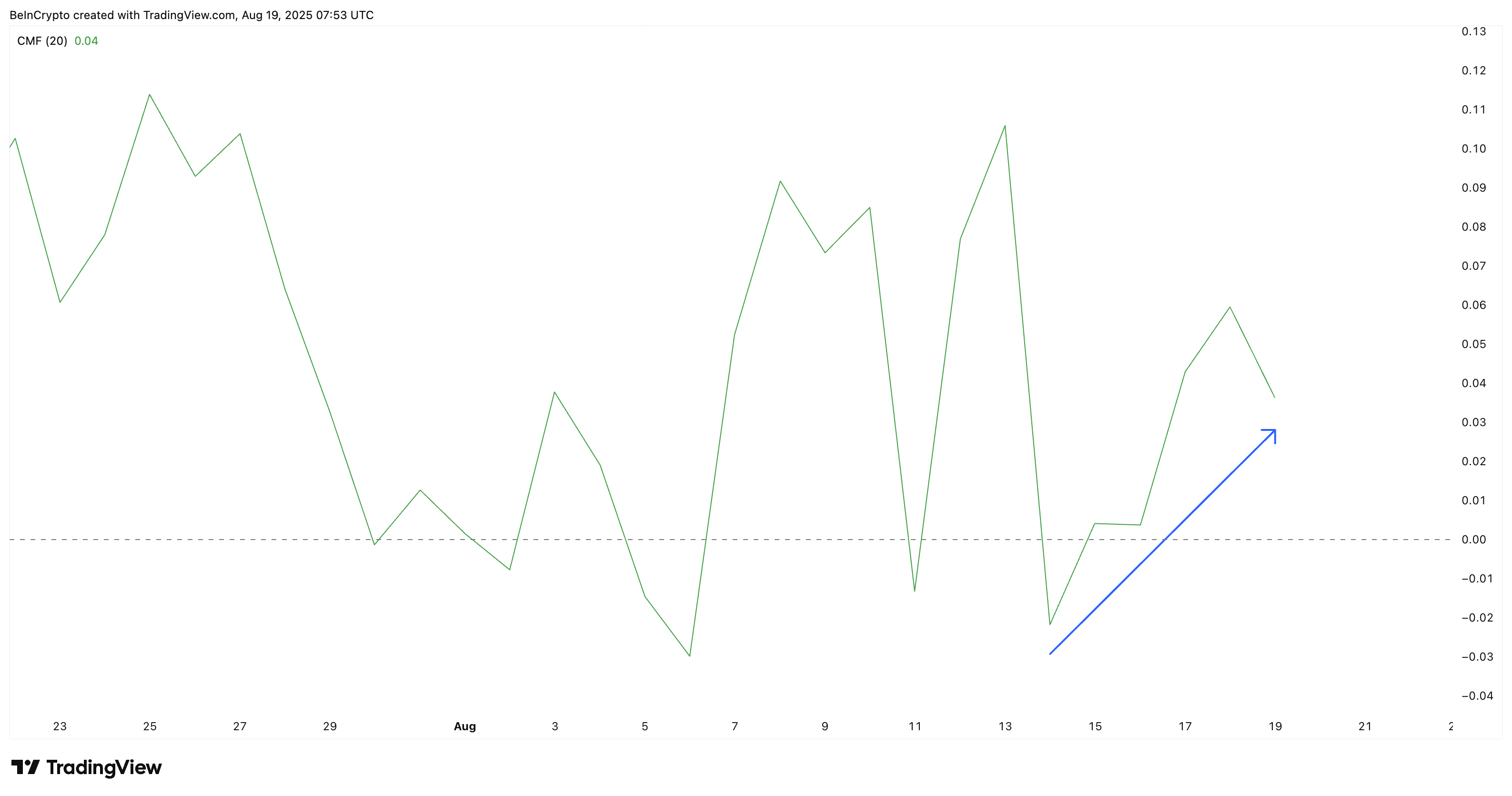 Индикатор Chaikin Money Flow (CMF) остается выше нуля, что указывает на чистый положительный приток капитала в SHIB. Это обычно происходит, когда крупные игроки покупают, а другие выходят из актива. С технической точки зрения, рост минимальных значений CMF означает увеличение денежных потоков в актив.