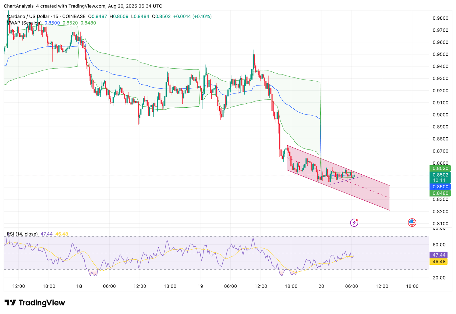 На 15-минутном графике ADA демонстрирует признаки сжатия внутри нисходящего канала. Индекс относительной силы составляет 47, что отражает нейтральные настроения и говорит о том, что трейдеры ждут подтверждения, прежде чем принять решение. Средняя точка VWAP на уровне $0,850 выступает в качестве опорной точки, при этом верхняя и нижняя полосы сужаются, что объясняет, почему попытки снижения цены Cardano ограничивались небольшими откатами, а не более сильным падением.