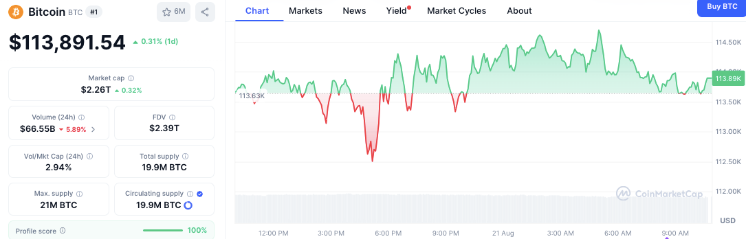 - BTC торгуется на уровне около $113 900 с рыночной капитализацией $2,26 трлн и дневным объемом $66,55 млрд.