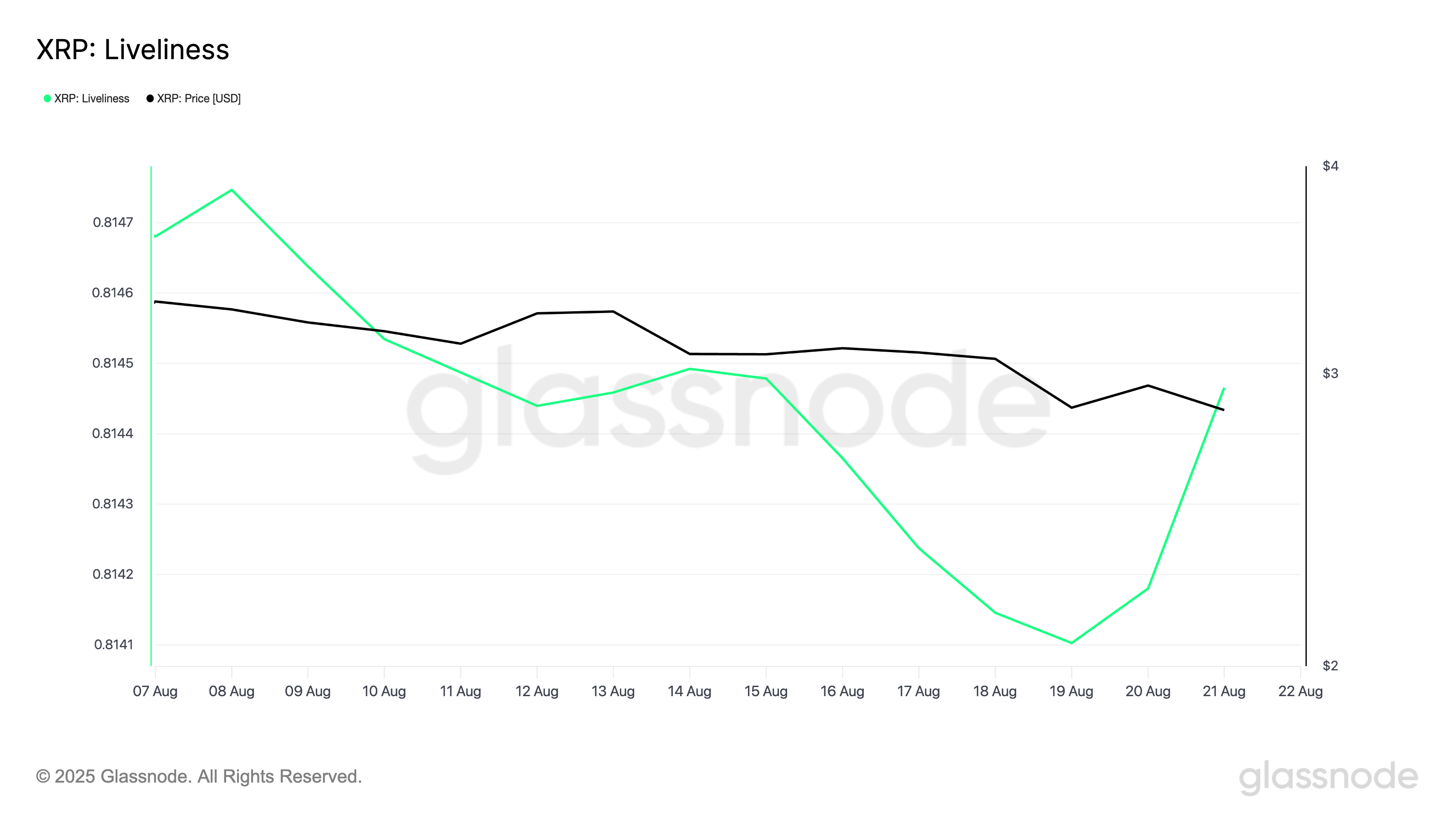 Оптимизм покупателей контрастирует с поведением долгосрочных держателей (LTH). Это видно по показателю Liveliness XRP, который стабильно растет с 19 августа.