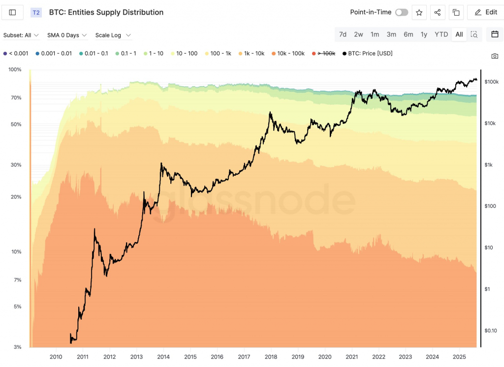 «Почему $BTC растет так медленно в этом цикле?» — задался он вопросом, приложив график. «Предложение $BTC сконцентрировано вокруг китов старой школы, которые достигли пика своих инвестиций в 2011 году. Они покупали биткоин по $10 или ниже. Требуется $110 000+ нового капитала, чтобы поглотить каждый $BTC, который они продают».