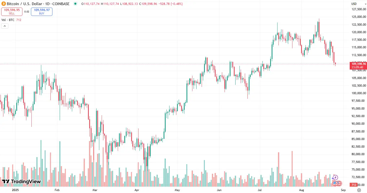 BTC во вторник упал ниже $109 000 на Coinbase. Источник: TradingView.