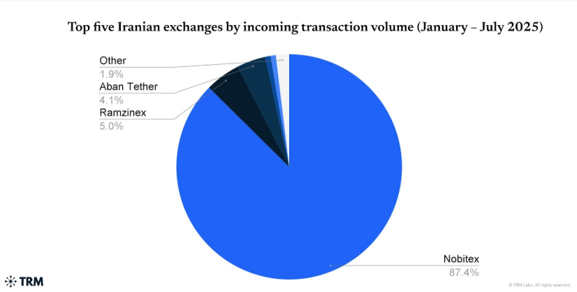 Аналитики подсчитали, что общий объем операций составил $3,7 млрд. Падение усилилось после апреля: в июне оно превысило 50% в годовом исчислении, а в июле — 76%. Nobitex сохранила доминирующее положение, обработав более 87% всех транзакций в стране. Из $3 млрд, прошедших через платформу, $2 млрд пришлись на сеть TRON.