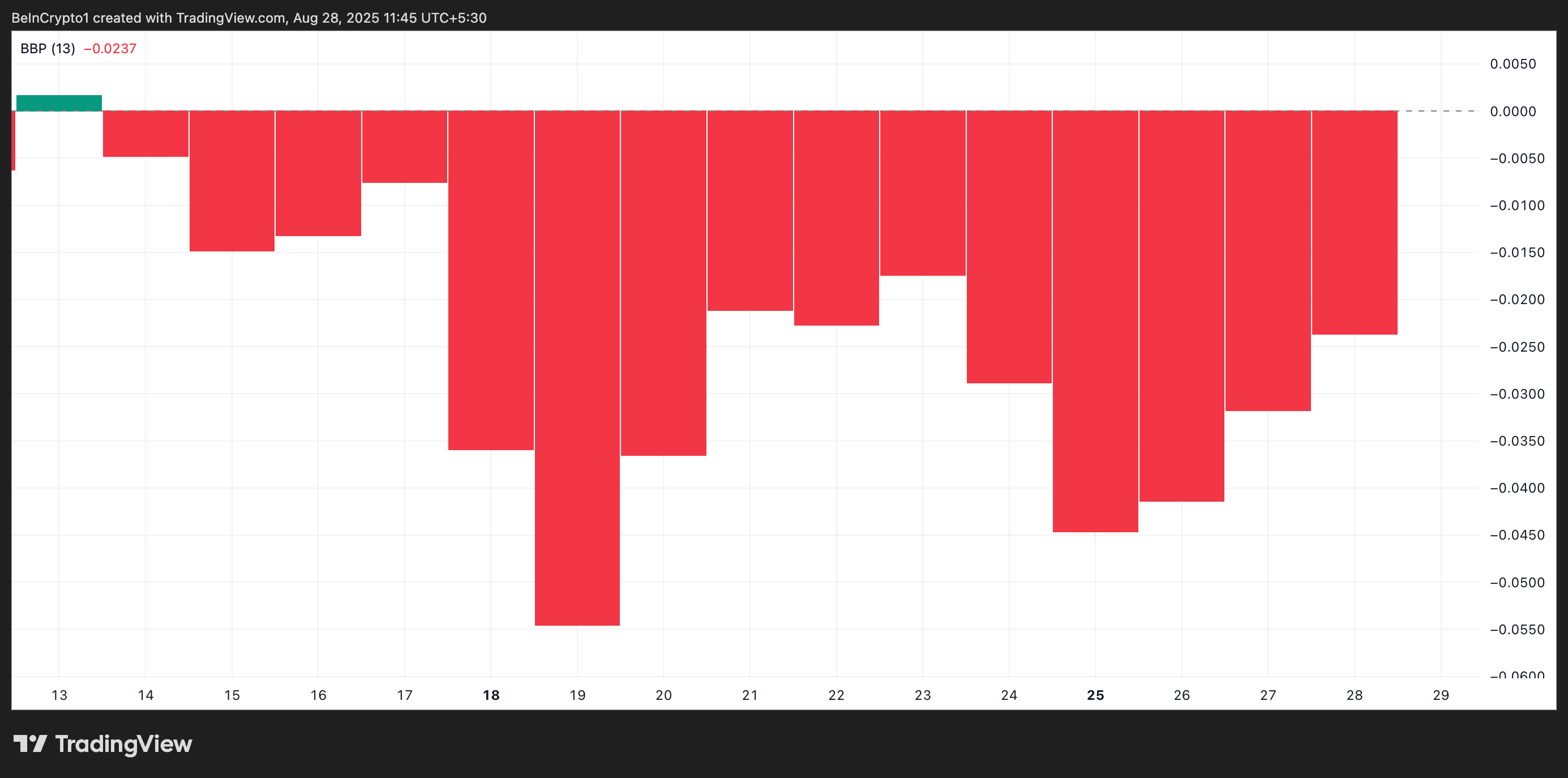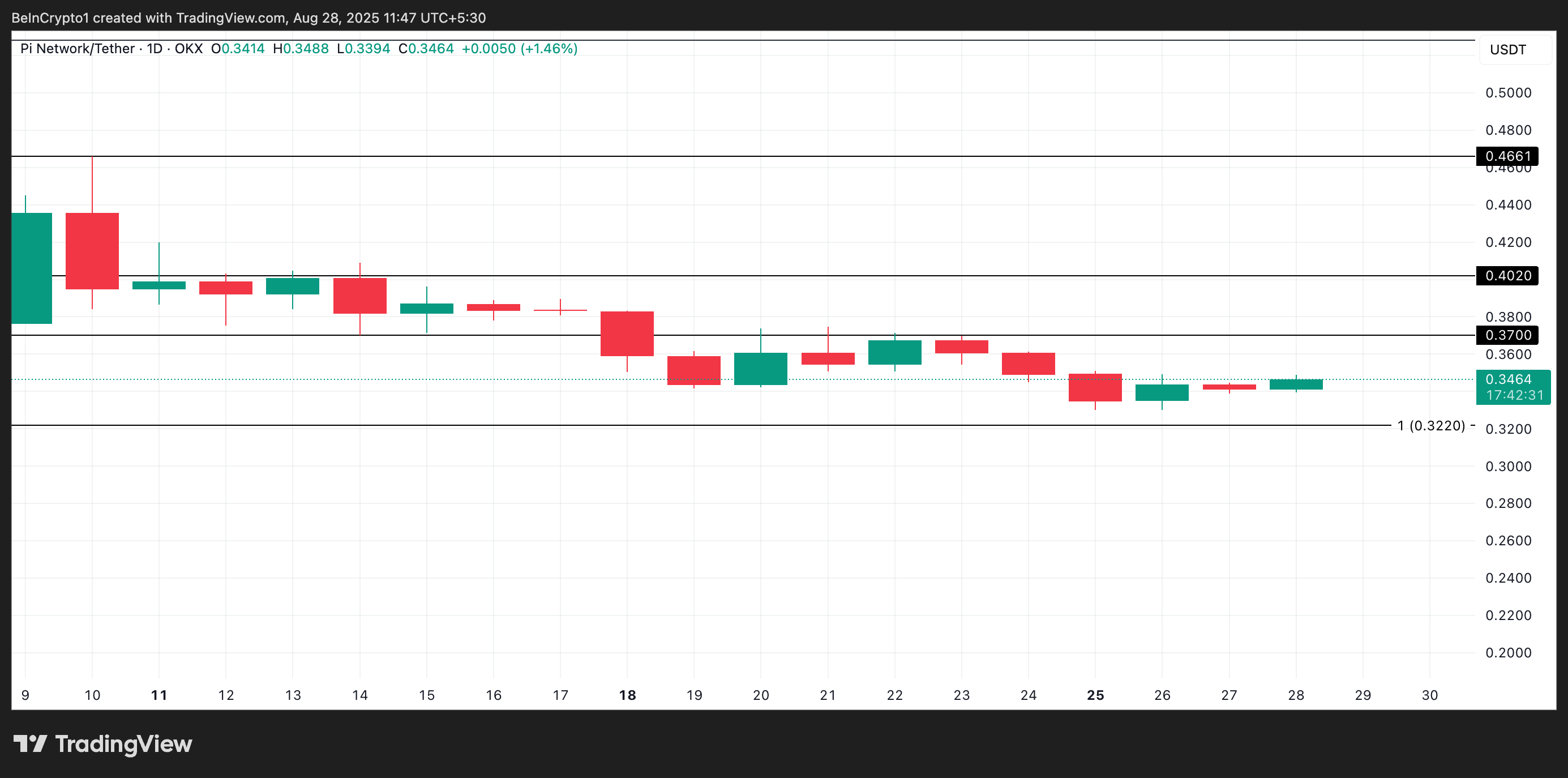 С 14 августа индекс Elder-Ray для PI стабильно показывает отрицательные значения, подчеркивая слабость рыночных настроений. Это постоянное медвежье значение отражает трудности токена в привлечении спроса.