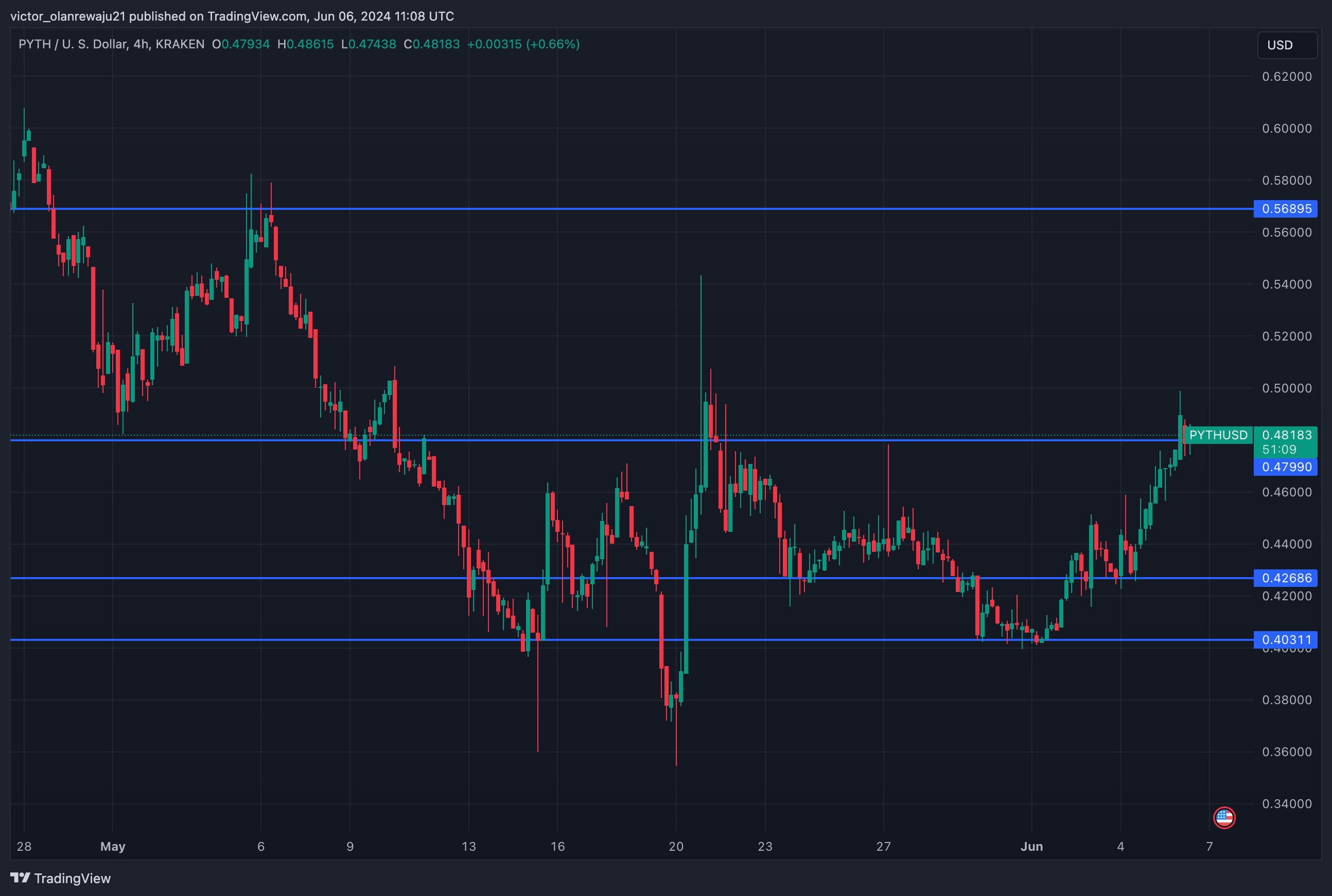 Coin Edition смог определить точки поддержки и сопротивления с помощью 4-часового графика. Для начала была поддержка на уровне 0,40 доллара, а позже PYTH столкнулся с сопротивлением на 0,42 доллара. Тем не менее, сопротивление было прорвано на момент публикации, что указывает на то, что быки контролируют ситуацию.