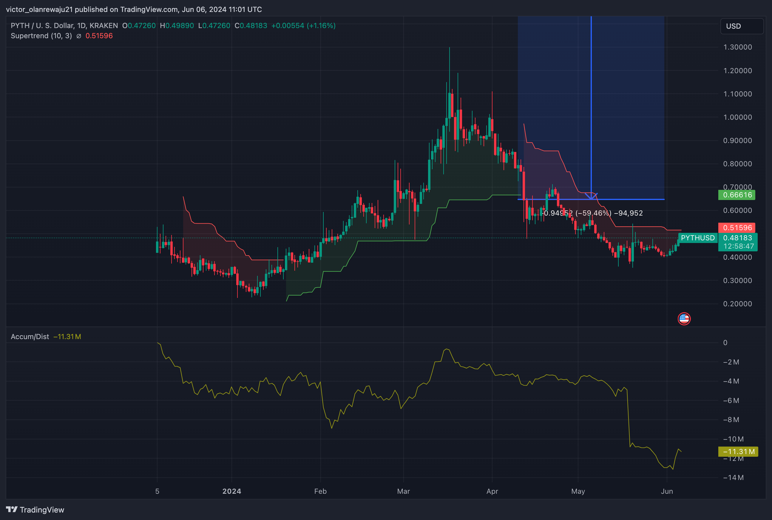 Для прогноза цены PYTH на 2024 год CoinEdition проанализировал дневной график. На графике, похоже, наблюдается возрождение накопления токена. На это указал индикатор Accumulation/Distribution (A/D).