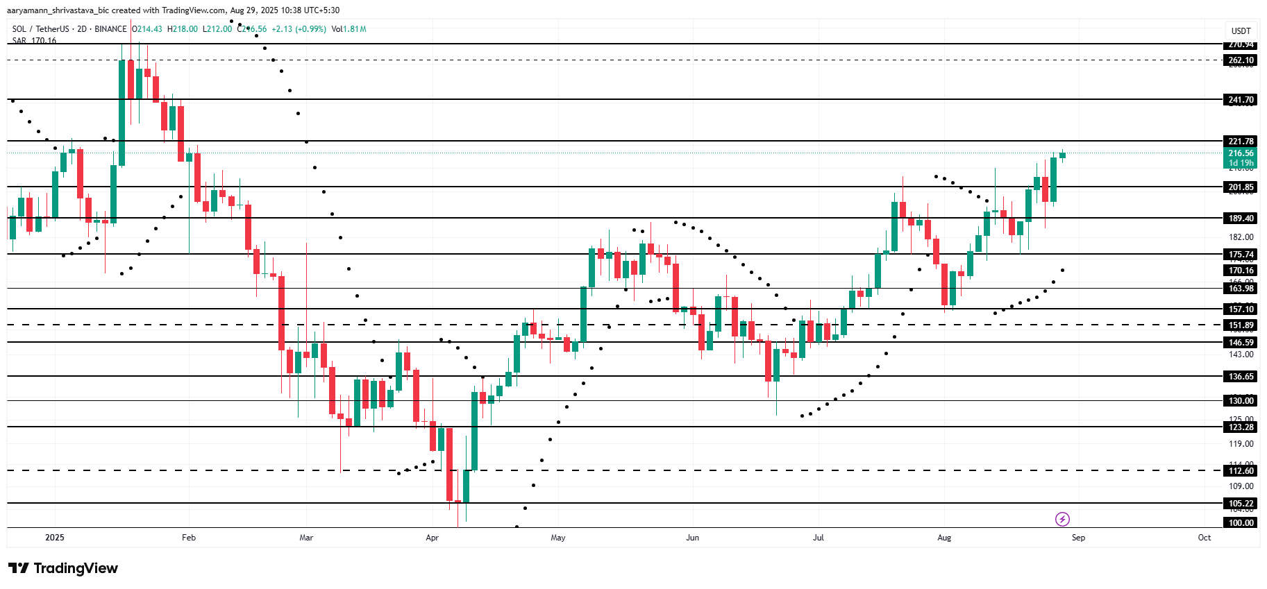 На момент написания Solana торгуется чуть ниже сопротивления на $221. Недавний скачок подбросил цену до шестимесячного максимума. Прорыв этого уровня важен для дальнейшего укрепления и подтверждения бычьего тренда. Точки индикатора Parabolic SAR располагаются под свечами, поддерживая активный восходящий тренд. Если Solana преодолеет $221 и превратит его в поддержку, она может усилить ралли.