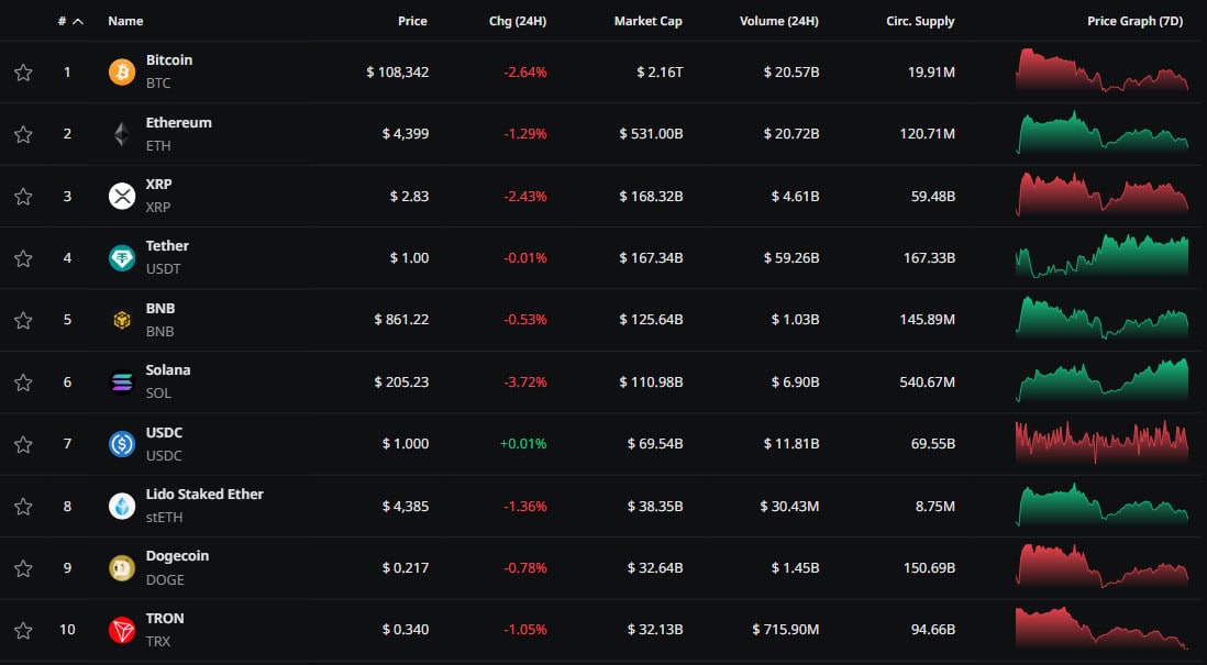 - В ночь на 30 августа цена биткоина опустилась ниже отметки в $108 000.