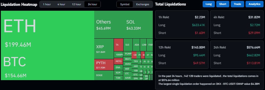 За последние сутки были ликвидированы позиции 142 128 трейдеров. Примерно $462 млн потерь пришлось на лонг-позиции, более $113 млн — на шорт. По активам преобладают биткоин и Ethereum — в парах с этими криптовалютами было ликвидировано позиций на около $155 млн и $199 млн соответственно.