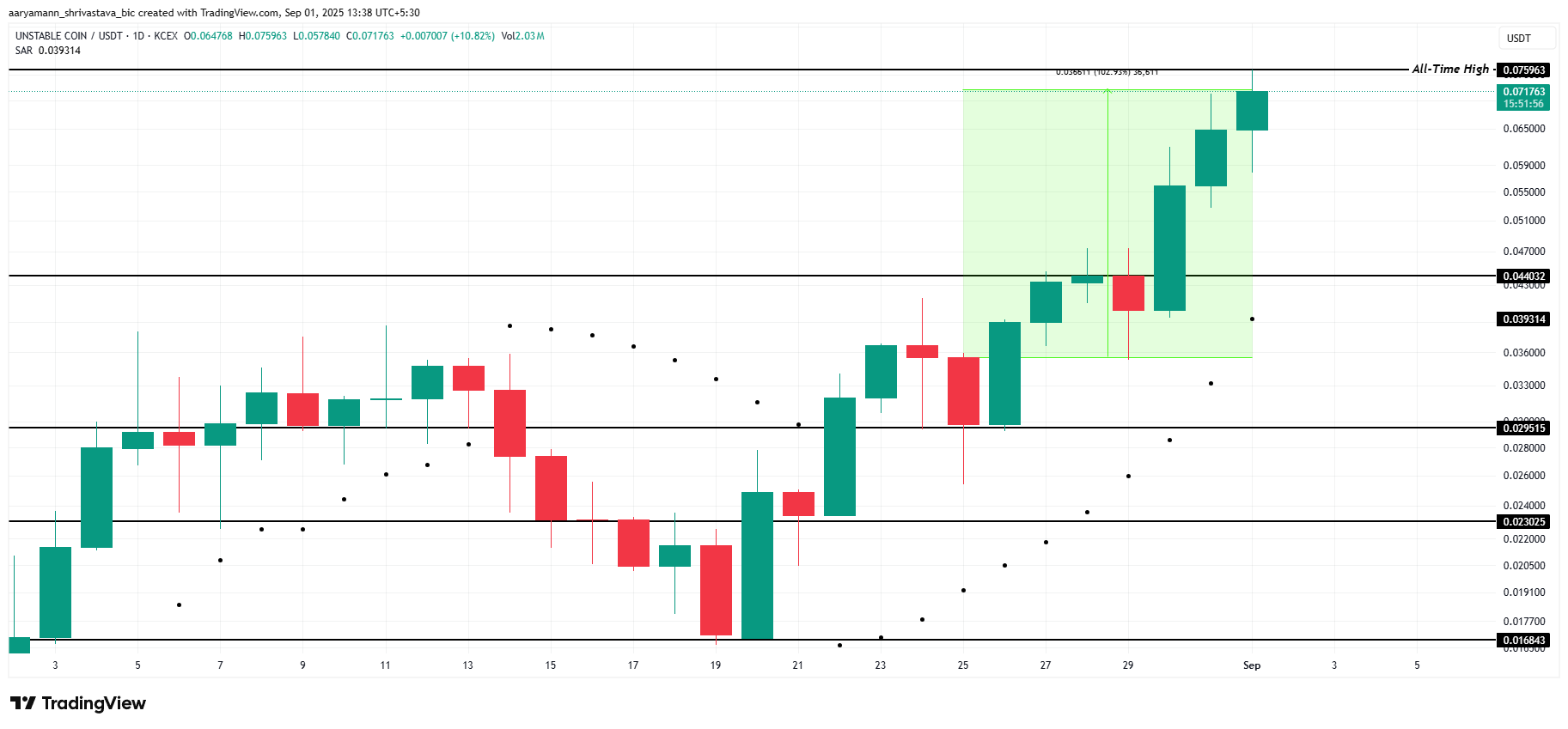 USDUC вырос почти на 103% за последнюю неделю, достигнув нового исторического максимума в $0,075. На момент написания статьи мемкоин торгуется немного ниже — по $0,071. Сильное ралли вывело USDUC в число лидеров рынка в период недавнего восходящего тренда.