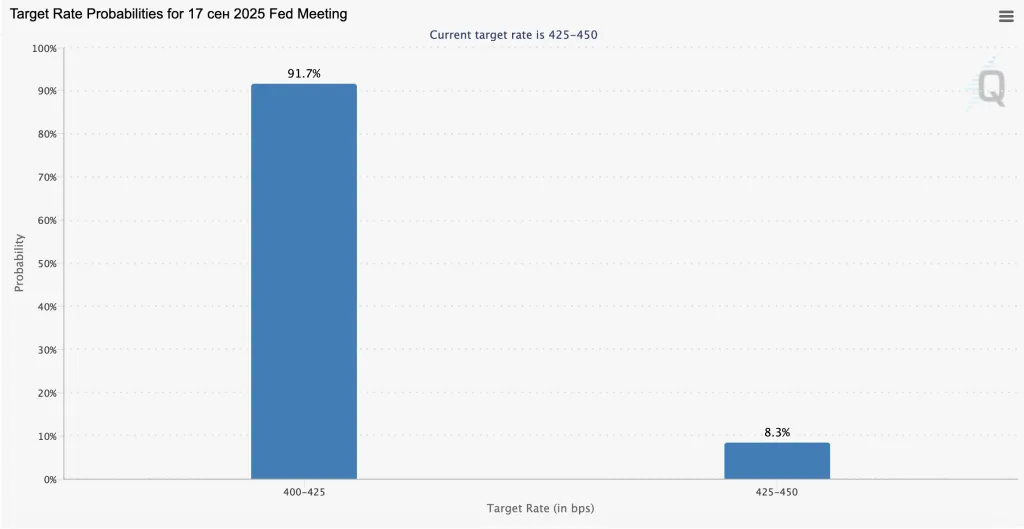 После прошлогоднего снижения ставки Федрезерва с 5,5% до 4,5% криптовалюты подорожали на 57% за четыре месяца. Инвесторы оценивают вероятность смягчения денежно-кредитной политики США в 91,7%. Показатель вырос после выступления главы ведомства Джерома Пауэлла на симпозиуме в Джексон-Хоуле.
