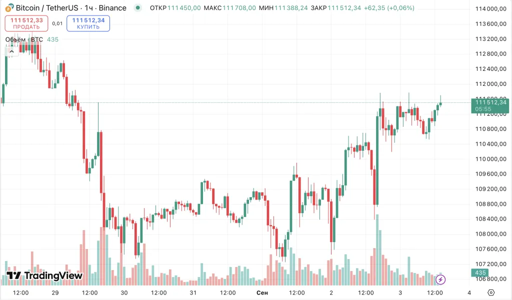 За последние сутки биткоин подорожал на 1,6%. На момент написания актив торгуется по $111 500.