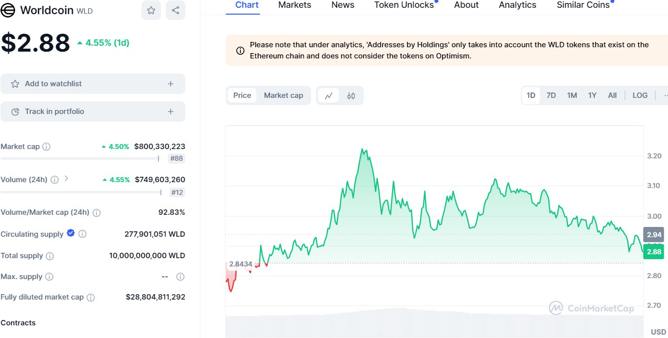 Worldcoin (WLD) привлек к себе внимание своим впечатляющим восхождением, вызвав ажиотаж в криптомире. За последние 24 часа WLD подскочил на 4,55% до 2,88 доллара, позиционируя себя среди самых эффективных криптовалют.